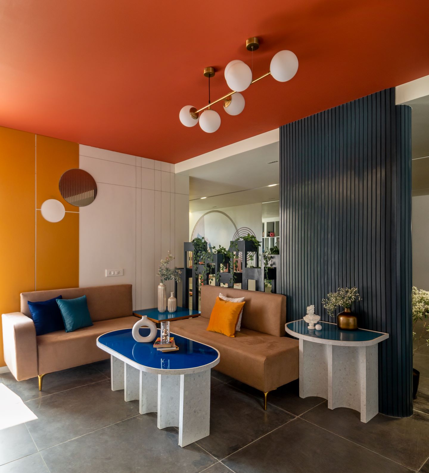 The overall space is dressed in combination of curve and straight geometric lines by using basic materials such as laminates, plywood, teakwood, MDF, and HDMR. But the main character of the space is brought together by the clever use of mirrors which makes the space look larger. Additionally, the drama of colours dominate the entire design. The Social Unit is held together by layers of interior designing elements, minimal furnishing, bold graphics, and vibrant colours, paying homage to eclectic design style.