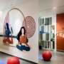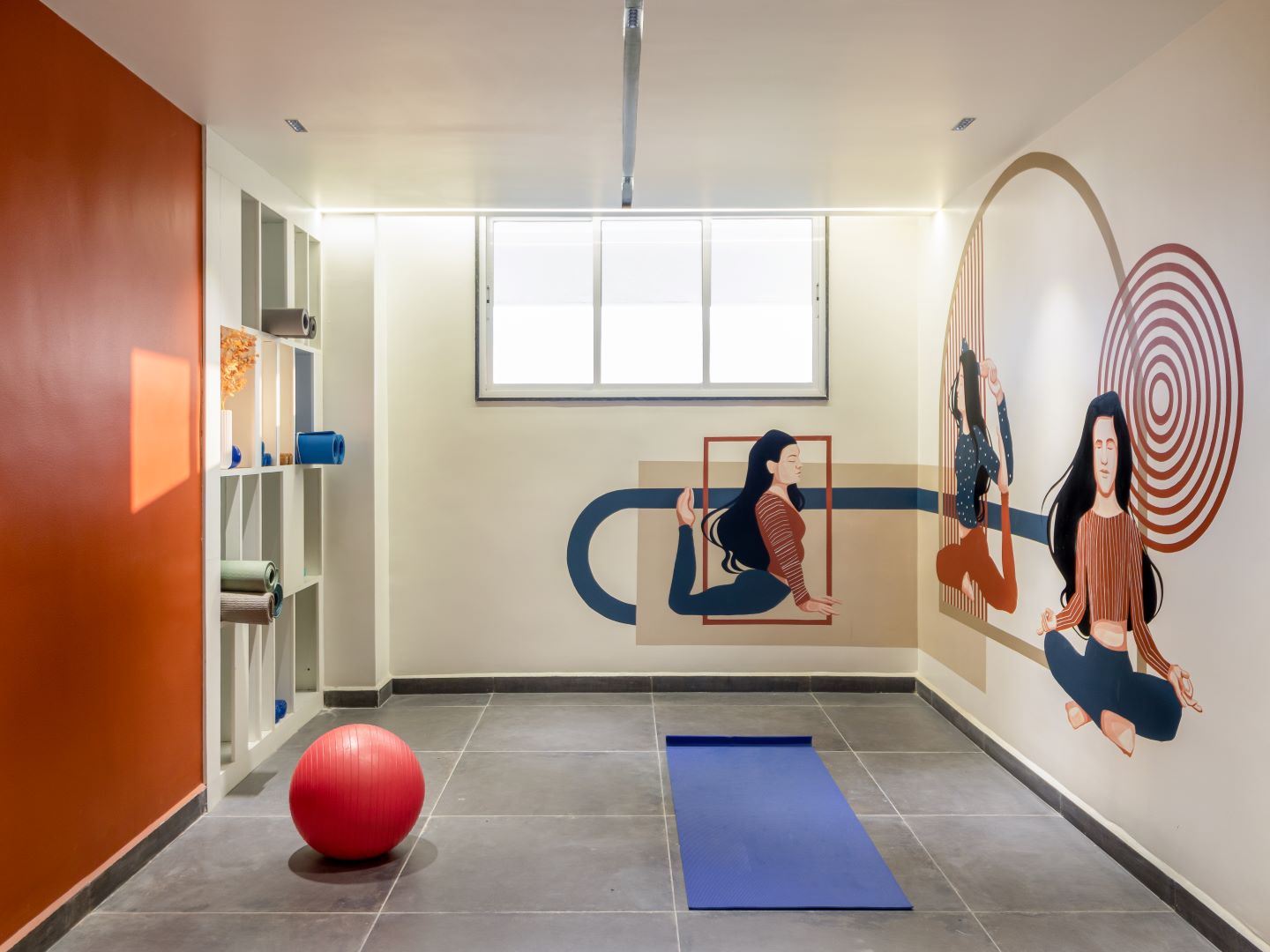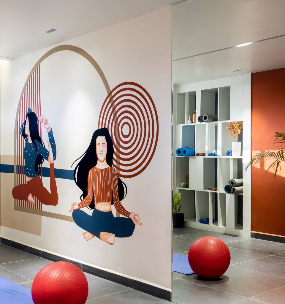 On entering this community space one is directed towards an arresting spacious lobby where a cacophony of colours on the furniture, walls, and floor impresses. Here, a partition with greens forms a perfect backdrop for an earthy brown-hued sofa coupled with customised accents that adds an extra layer of detail. The lobby further connects to the yoga area with a graphite wall, an indoor play area draped in shades of blue, and a kids’ zone. With the limited space, the notion was to create open and continuous activity areas that are interlinked to create a sense of largeness. Thus, a conscious attempt was made to avoid solid walls with storage partitions in a variety of captivating hues. As a solution to many columns obstructing the connectivity, each one was treated differently. For instance, some were merged with the furniture while others were cladded with appropriate material.