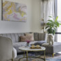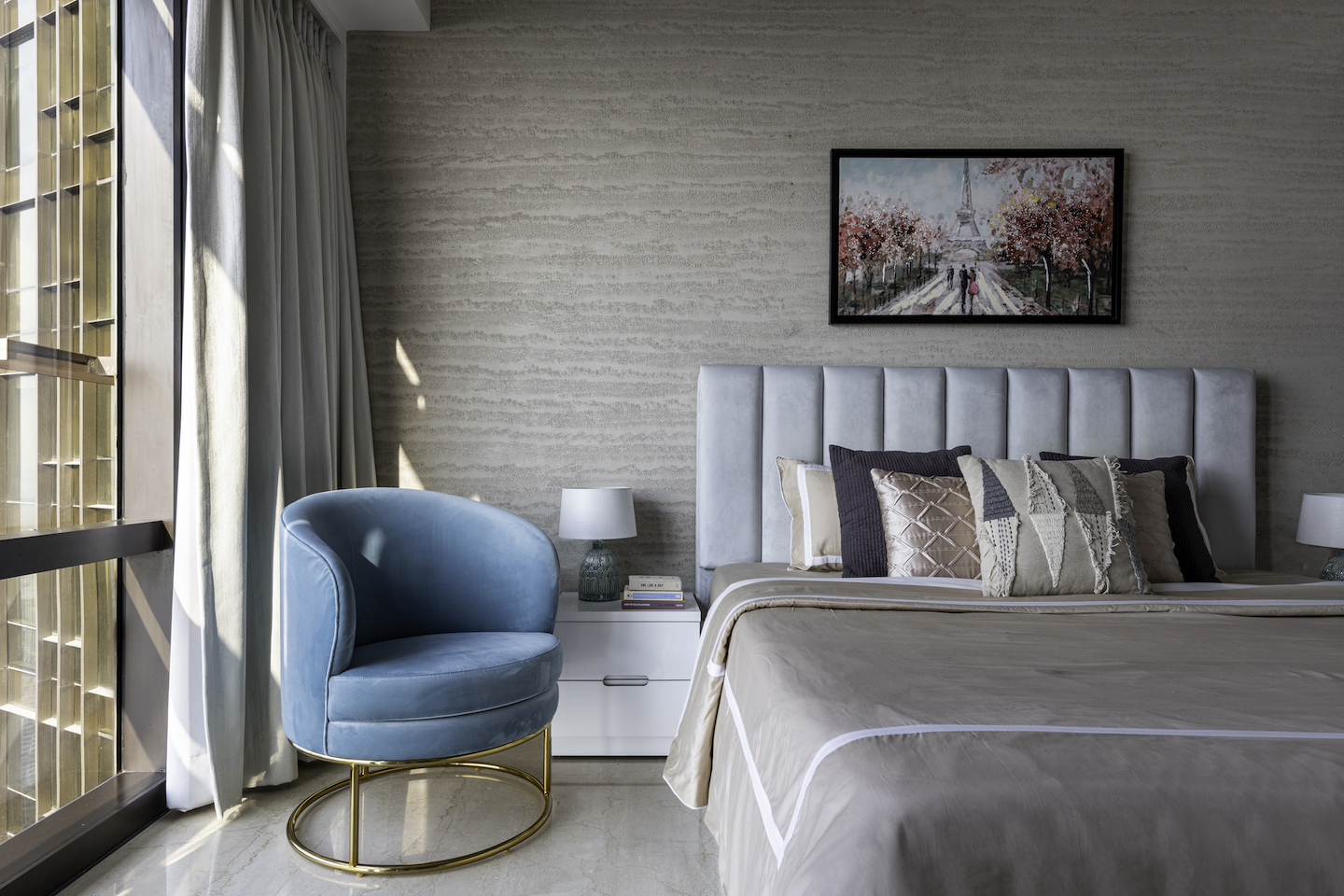 Textured wall paint and artwork join hands to add character to the walls. The material palette mainly features suede, PU paint, mirror, glass and gold metallic accents to render a contemporary feel.