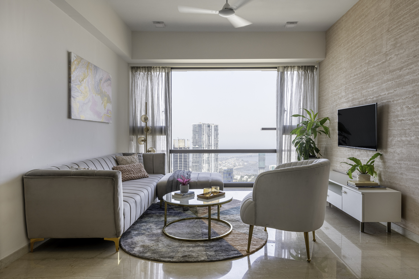 This sprawling 1,300-sq-ft, 4BHK apartment on the 67th floor of one of Mumbai’s high-rises enjoys uninterrupted views of the city skyline and the sea from all the rooms, with ample sunlight filtering in through the floor-to-ceiling windows.