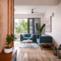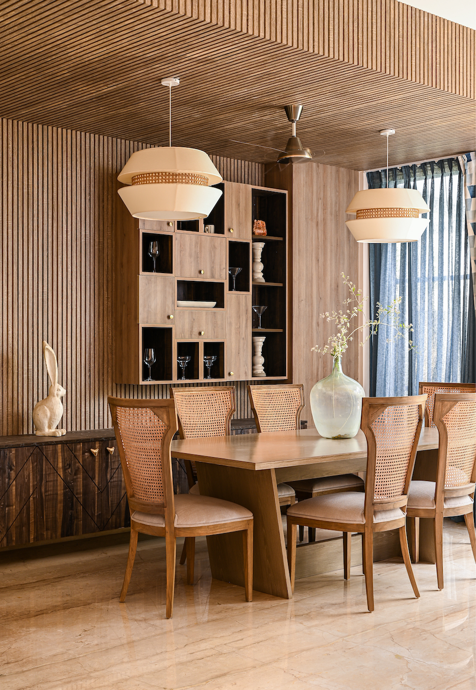 Right from the foyer, a golden framed mirror and painted blue, rustic console set the mood for the colourful journey. To the right, sofas cuddle around a pair of centre tables. The eye travels to the balcony, featuring grey-dyed wooden flooring and a garden bench and brimming with a view of lush trees. The dining area, Swati’s favourite space, sees the exploration of a single material for its textural and tonal shifts. The low-height ceiling and wall is clad in wooden strips, while the wood dining table is paired with cane-backed chairs. Alongside a dark-stained cabinet and display piece, a white bunny sculpture and ceiling lamps elegantly accent the setting.