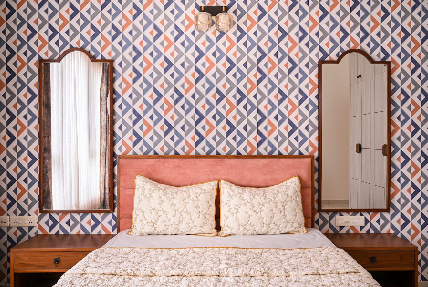The bedrooms are accessed by a staircase whose wall is bedecked with a large mint green mirror and red floral wallpaper. Arul’s father’s room features a bed with a green upholstered headboard and matching side tables made in-house. Facing the bed, a console incorporates a matching green shade as stripes. Artwork, reminiscent of Arul’s sailor background, stars against a light-hued patterned wallpaper.