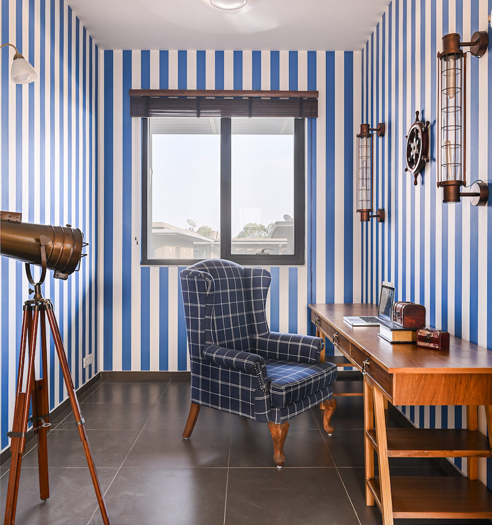 Outside the master suite, is Arul’s study, covered in blue and white striped wallpaper and featuring a 9-ft desk. Bronze finished accessories like a telescope and wall-mounted sailor’s wheel refer to the marine storyline. Finally, the master suite establishes continuity with the study room by using blue in the wallpaper, tufted headboard of the bed and side tables. The dominant use of oak wood and a roomy walk-in wardrobe behind sliding wooden doors establish its stature as the most lavish room in the home.