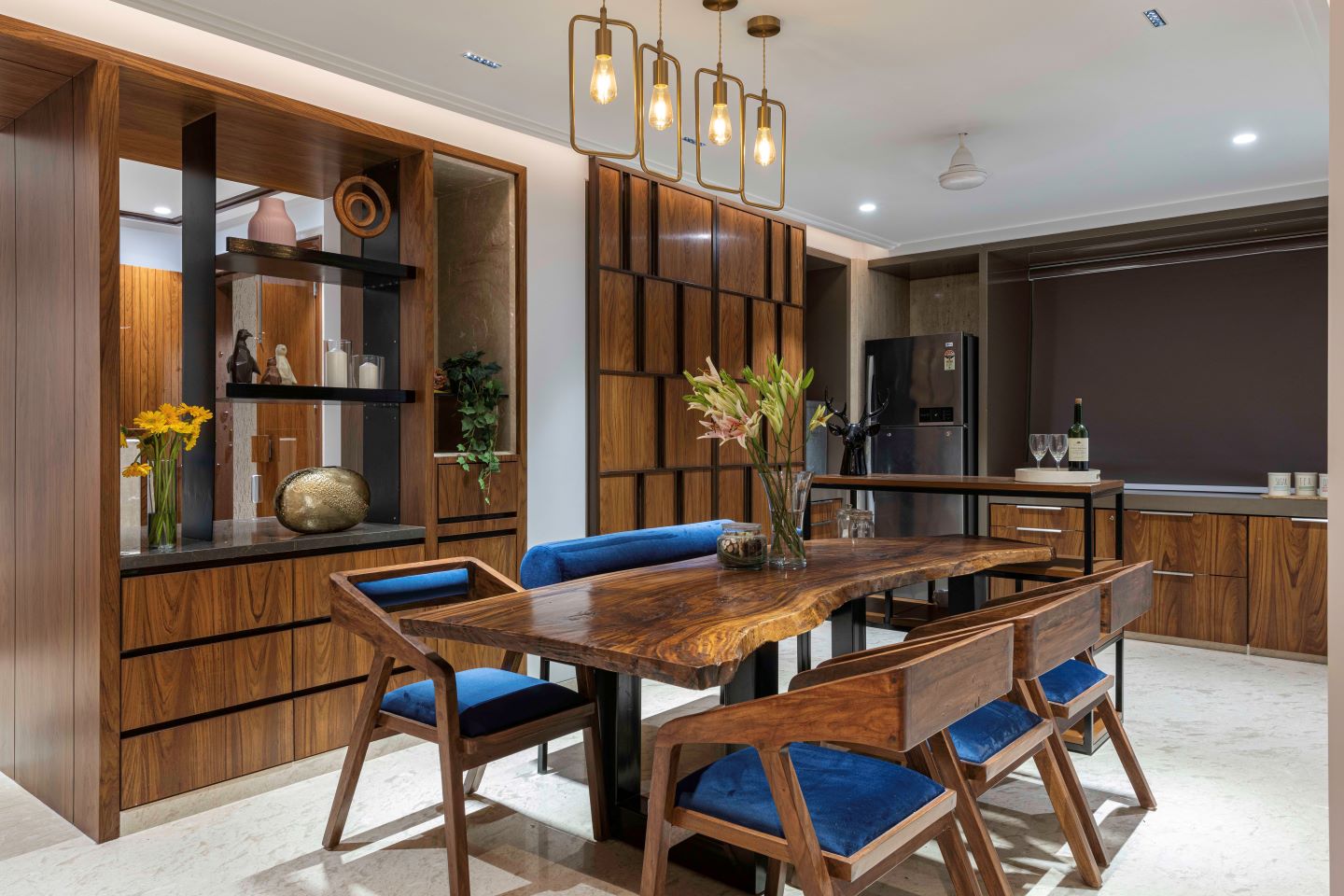 A grand entry with a water body, pergolas and staggered steps leads to the entrance lobby where one can have a few minutes of calm on a plush single seater before stepping into the living room. The living room has both, the formal and informal seating zones (replete with a jhoola) to suit every mood of the family. The walls and ceiling here are enveloped in subtle shades of olive green. Along with the living room, the ground floor also accommodates a dining, kitchen and bedroom. The bedroom on the ground floor gives a sense of luxury and grandeur with the travertine marble clad back wall and a headboard in purple and gold. The bedroom on the first floor has a luxurious feel with a walk-in wardrobe space and an indulgent bath tub.
