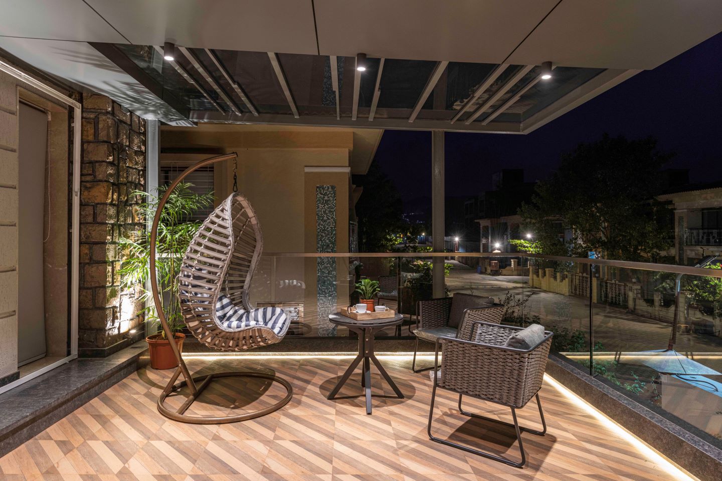 The third bedroom gives a classic vibe with arches, a sloping roof and high ceiling. The gold, beige and brown fabrics used here room adds to the look. The blue bedroom was specially designed for the youngsters in the family and has a playful mood created with the subtle use of pastel blue wood and low beds. This room has access to the spiral staircase that connects to the gazebo which offers the perfect ambience to play a board game or simply have conversations over their favourite cuppa. The indoors and outdoors area connected through verandahs and terraces with views of the open lawn and the beautiful landscape of Lonavala.