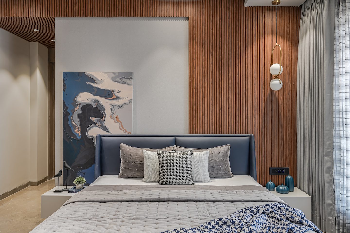 The bedrooms, on the other hand, are a balance of minimal panelling with deeper lush fabric beds. Pendant lights, abstract artwork, free-standing side tables and minimally designed PU wardrobes add a touch of modernity to the rooms, while the colour combination gives a luxurious character.