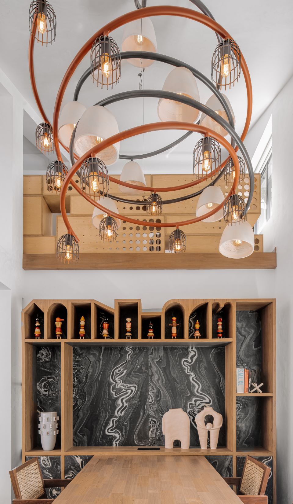 The Resting Chair, an installation created by MuseLAB is placed gracefully by a window reflecting the various moods within the space. A definite conversation piece is the chandelier which was designed in collaboration with Jeet Soneji, a MuseLAB alumnus. The DNA Chandelier is fabricated in metal using pipes to form a double helix consisting of ceramic bells and contrasting metal baskets. “This light installation stands for who we are and our story. It represents the MuseLAB DNA — the way we do things, which is difficult to describe but evident in our process and what we create,” the architects explain.