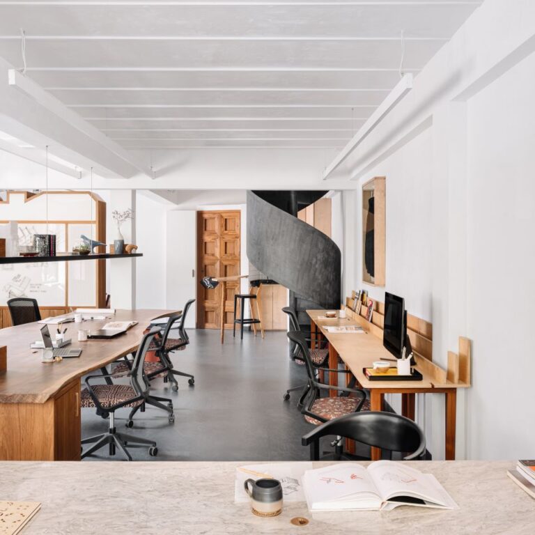 “The details and gestures within the space are meticulously planned moments of discovery. Materials are layered throughout the space, from warm woods in the custom made cabinetry and work surfaces to stone countertops and tiles and a custom-made wallpaper in our restrooms. Tactile surfaces embedded in our DNA form a crucial part of our work — it is always about materials, textures and forms. Craftsmanship and collaboration resonate through our practice which reflects within our space. Each furniture piece, object, rug or light piece evokes an emotion. We choose to surround ourselves with objects and art that are unique,” says Huzefa.