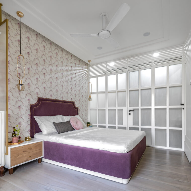 Vitrified tiles were selected for the floor and composite marble for all window frames and kitchen tops. The carpentry work entailed use of plywood and laminate, and solid wood for mouldings and cornices. The colour palette was fresh and hues of pink and green dominate the living room. The purple and white bedroom also uses similar materials, with the added presence of glass for the closet shutter to bring in natural light.