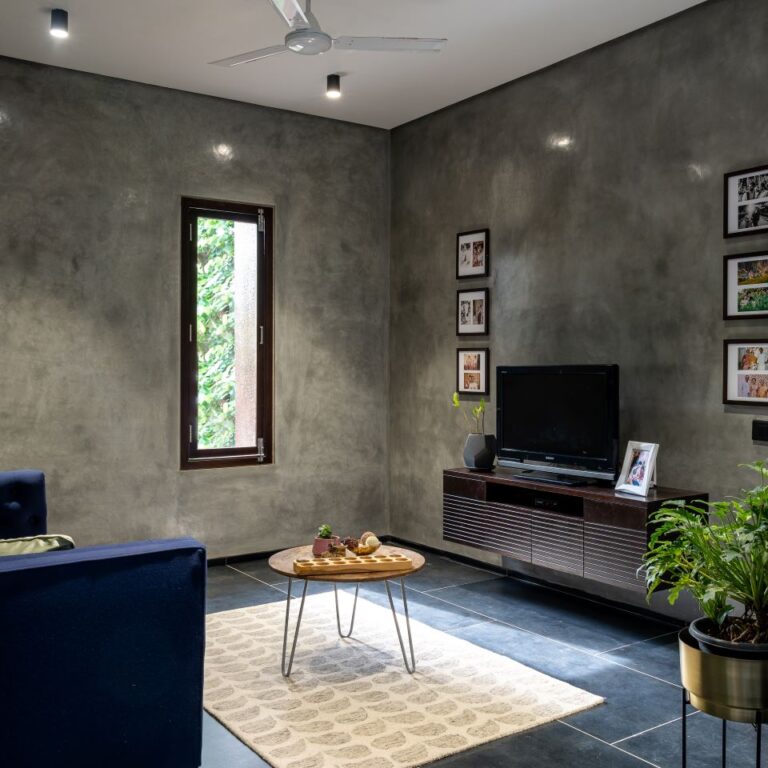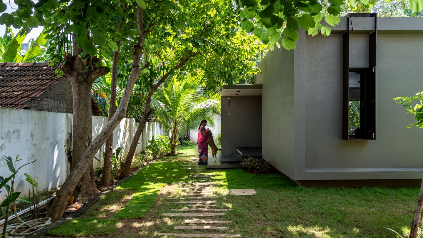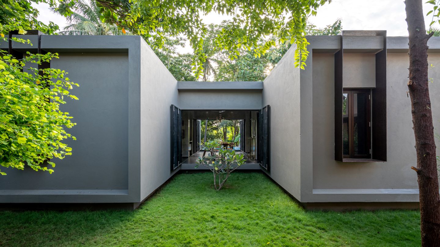 Locally sourced Corten-effect steel boxes near Karaikal port break the monotony of the concrete and highlight the windows of the structure. The plinth of the entire house is tucked inside to give the building a raised look off the ground, thus reducing the heaviness of concrete and creating a sense of tranquility in and around the place.