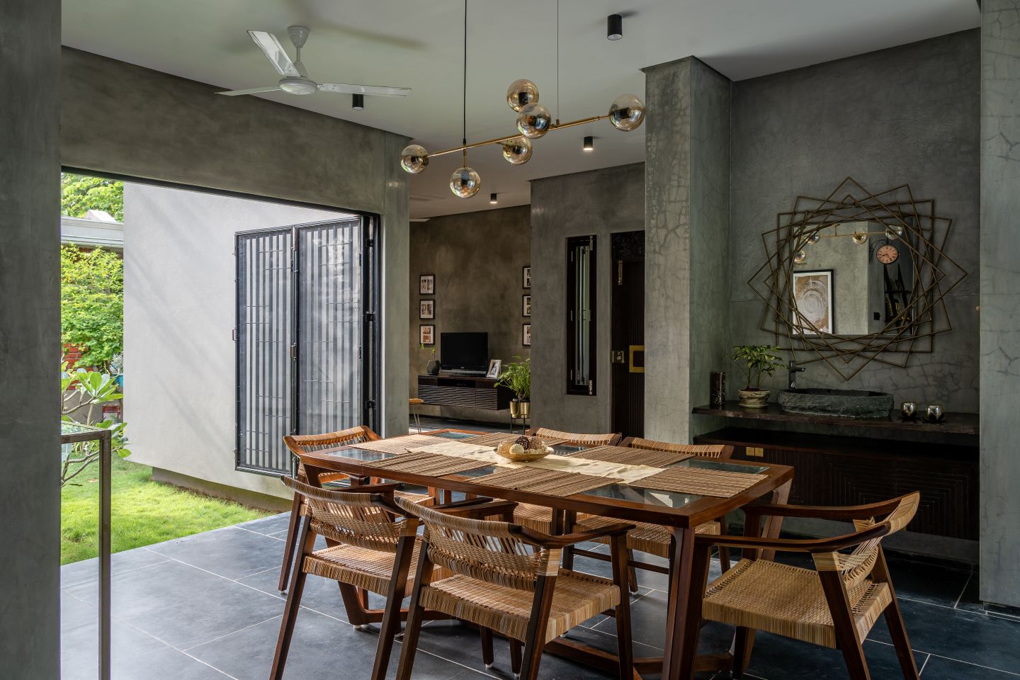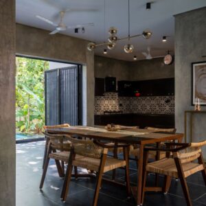 For the interiors, a simple colour palette of black and white was chosen with earthy wood as accent. Lime-based polished grey oxide walls and black vitrified tile flooring set a monochrome and minimal background with bright coloured furniture and decor acting as contrast.