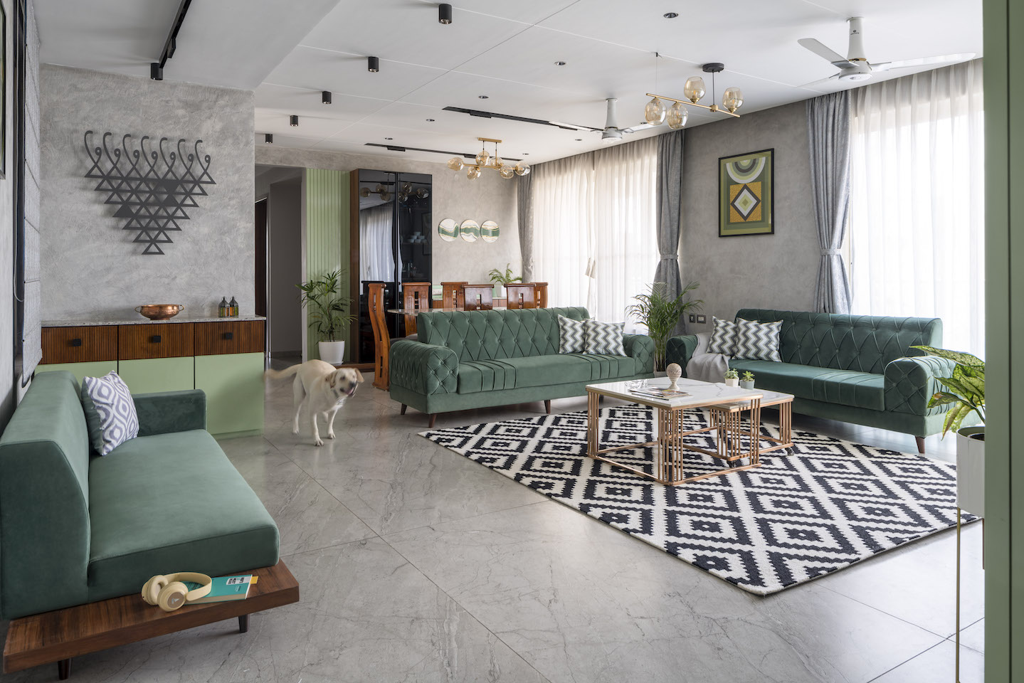 Positioned in the east of the north-east zone of the house, the living room evokes the ‘air’ element through the shades of green in the upholstery, panelling, wall art and natural plants. Fluted sage green panels over the parallel walls with concrete texture set a relaxed mood for the space. “The spacious living area has been planned very carefully, and can comfortably accommodate a family gathering, while also leaving ample room for circulation and spatial perception of openness,” reveal the designers.