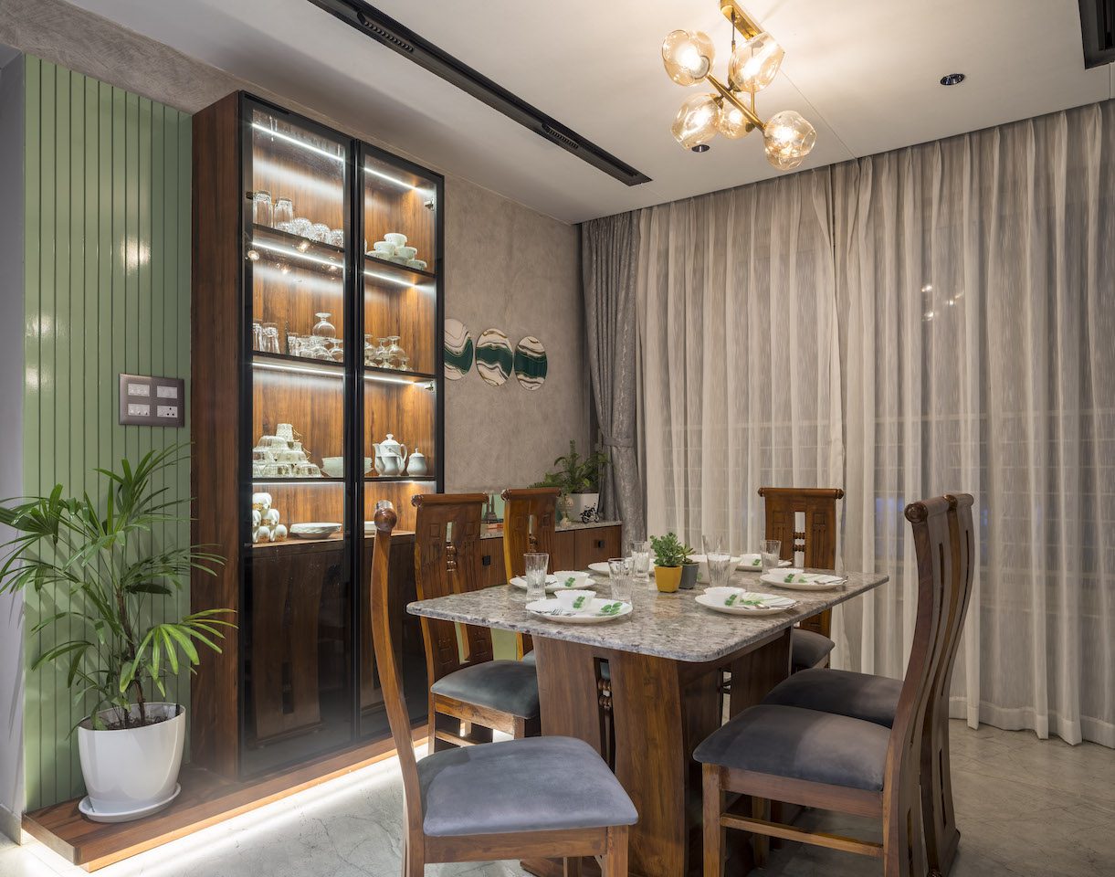 In the dining space a compact, rectangular marble-topped dining table stands next to a custom-designed crockery unit. The brass pendant over the dining table creates drama with its luminous reflections, accentuating the marble top.