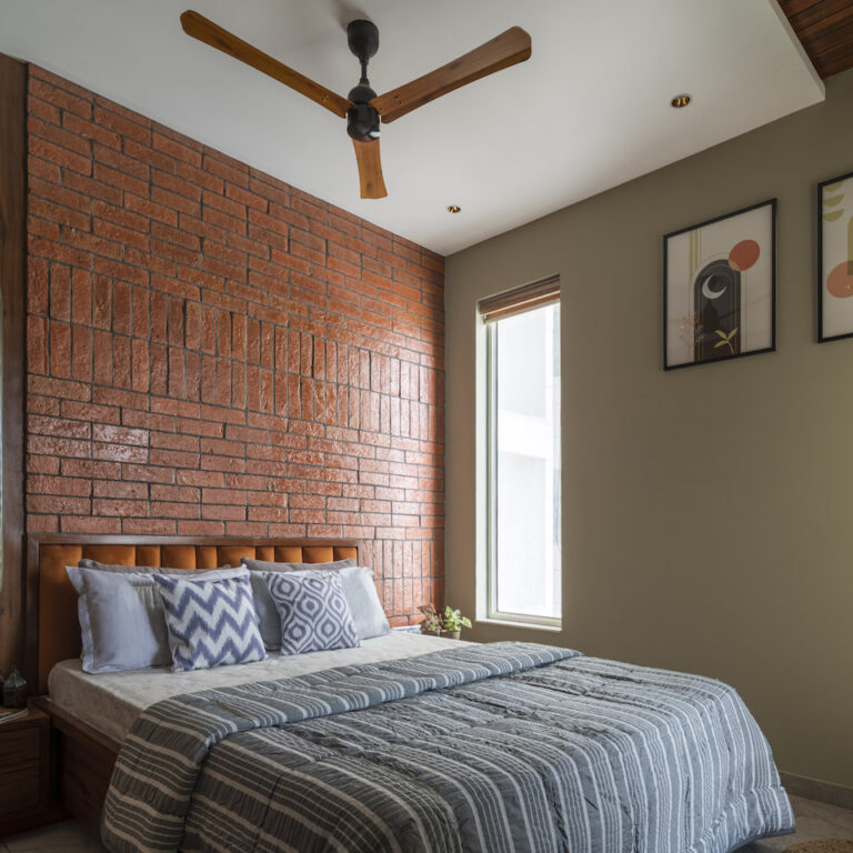The elder son’s bedroom is both vibrant and earthy, thanks to the rust bed back and brick-cladded wall, complemented by olive green walls. The colours and material together present a sense of warmth, depicting the ‘fire’ element in the south of the south-east direction.