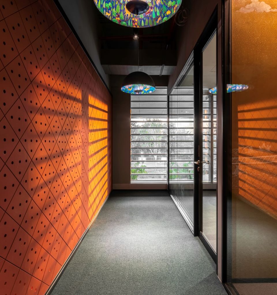 The design intervention for Trilegal celebrates and promotes artisanal skill sets through ‘Contemporizing Craft’, demonstrating how architects, designers and other stakeholders can find meaningful ways to engage craftspersons and offer them an opportunity to thrive. The honeycomb-inspired office layout functions as a hybrid between an open office and a cubicle, enabling focussed work as well as meaningful interaction between co-workers at a safe distance. Through its design, use of timeless materials, and vivid storytelling, the Trilegal office acquires an identity of its own: a balanced expression that unites the law firm’s roots in Indian culture with the egalitarian spirit and aspirations of its new-age workforce.