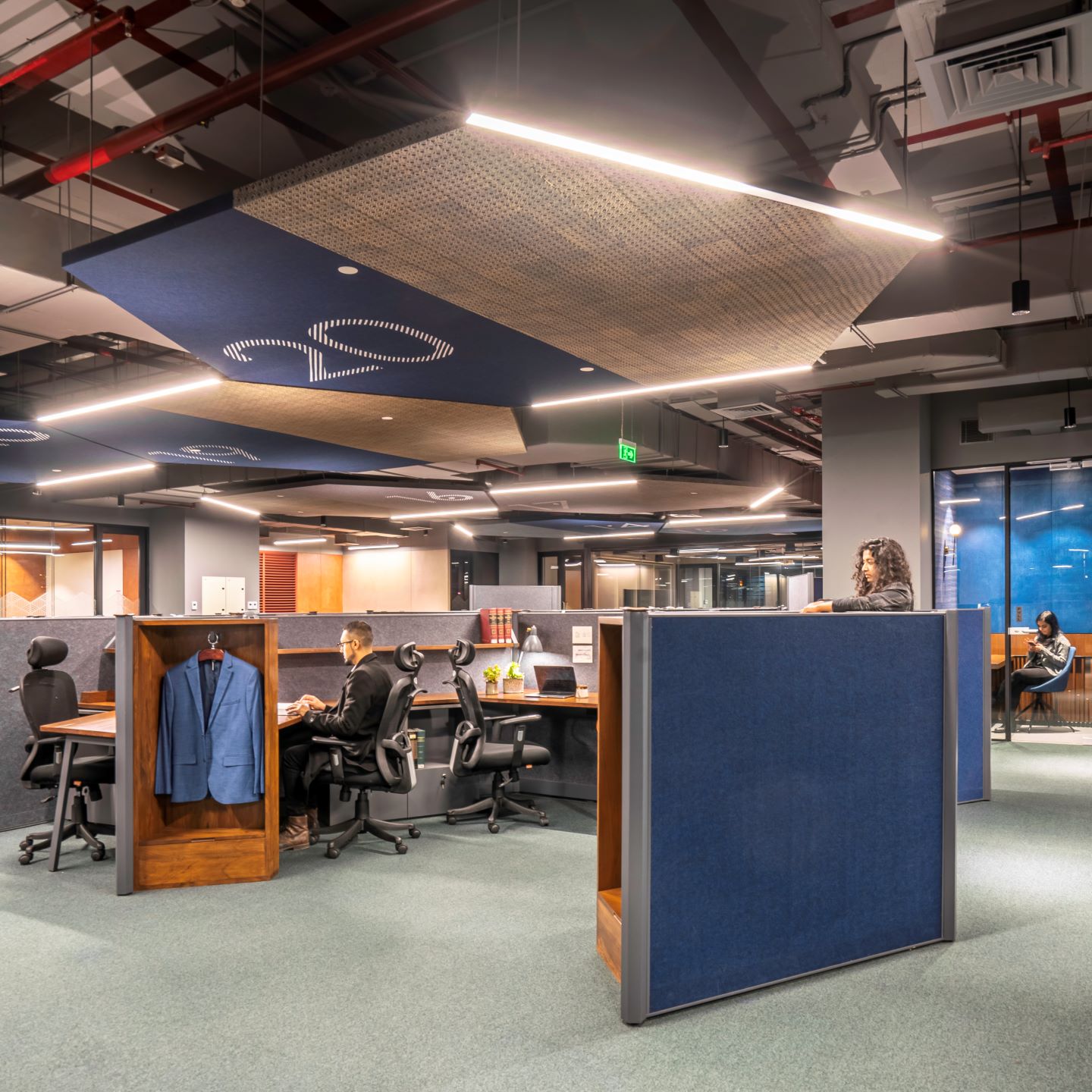 The workstations flanking each side of the Town Hall are arranged in a segmented honeycomb formation, with pods for teams of two and four individuals. Designed and engineered in collaboration with MKraft, these hexagonal workstations enable privacy while ensuring easy collaboration and flexibility for the teams. The placement of the larger pods near the partners’ cabins is conducive to creating an intertwined system that enables better communication and coordination; the smaller pods are peripheral in nature, serving as smaller breakout spaces away from the main desk. The pods are separated using blue and grey acoustic Matterwall partitions, which double up as soft boards. The partitions are equipped with a coat and a shoe rack to allow employees to move in and out of the workspace as per the changing requirements of a typical work day.