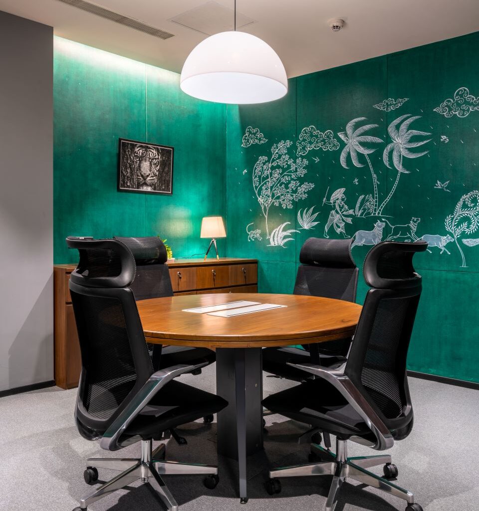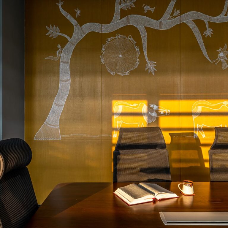 The corridor features spun mild steel dome lamps embellished with papier-mâché-style hand paintings by Kashmiri artist Hakim Gulam Mohammad. The boardroom employs a wall-hung metal installation, featuring Chhattisgarh’s famous Bastar iron craft. Depicting the cultural practices, musical instruments, and the fauna of the region, three metal panels handcrafted by award-winning artist Tiju Ram Vishwakarma complement the blue cement board walls, creating a textured canvas for the craft to stand out. In one of the meeting rooms, Gond paintings evoke the imagery of a forest on green coloured cement board walls. Painted by artist Dilip Shyam, Gond’s uniqueness lies in the signature dots and small strokes that build up in geometric textures within an animistic belief system. The Gond paintings that trace their provenance to the Gond artists of Central India illustrate the interiors of a meeting room. True to their age-old storytelling traditions, recurrent motifs of tribal art—animals and birds, rivers, flowering trees…— are hand-painted on the walls by artist Dilip Shyam to evoke the imagery of a forest. Similarly, Godna (an age-old tattoo art from North and Central India) paintings by artists Ranjit and Dilip Kumar Paswan depict jungle lore on the mustard surfaces of one of the meeting rooms.