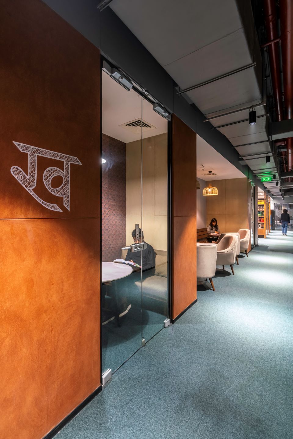 In tune with the hexagonal pods, large composite panels are installed to create a system of floating ceilings, helping ascribe individual identities for every workstation and improving their acoustic performance. The panels feature Ajrakh block prints inspired from Kutch in Gujarat, and are numbered to facilitate wayfinding within the workspace. Other crafts include Pattachitra (folk art form of scroll painting) paintings from the eastern state of Odisha and Warli paintings, a form of tribal art from the state of Maharashtra. Smaller craft expressions dot the shared spaces; the Ikat handloom craft and Shibori fabric art embellish the rear walls of the phone booths. Private pods here are hand-painted with Hindi alphabets to distinguish them from other pods. A hand-painted mural inspired by the historical Mughal miniature-style paintings form the backdrop to the cafeteria while handcrafted brass sinks with intricate floral engravings by designer Ayush Kasliwal sit within the washrooms, drawing attention to the tiniest details that underpin the overall design intent.