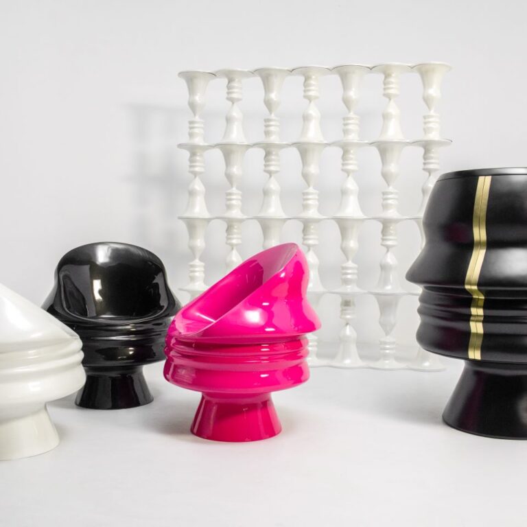 Scarlet Splendour’s latest collection is in collaboration with renowned designer Karim Rashid. Named the Ego Collection, the Karim has taken inspiration from his student days — when he was training under Gaetano Pesce, and was assigned an unusual project of designing a drinking glass fashioned after a human head or face. Karim’s fascinating new pieces are a re-imagination of this concept, and he has worked this facial motif into five original pieces that exude sophistication and luxury. The exquisite pieces include: a dramatic and thought-provoking black cabinet with a gold brass inlay, a sumptuous human face chair available in Hot Pink, Pearl White, and Black, and a stunning Pearl White screen.
