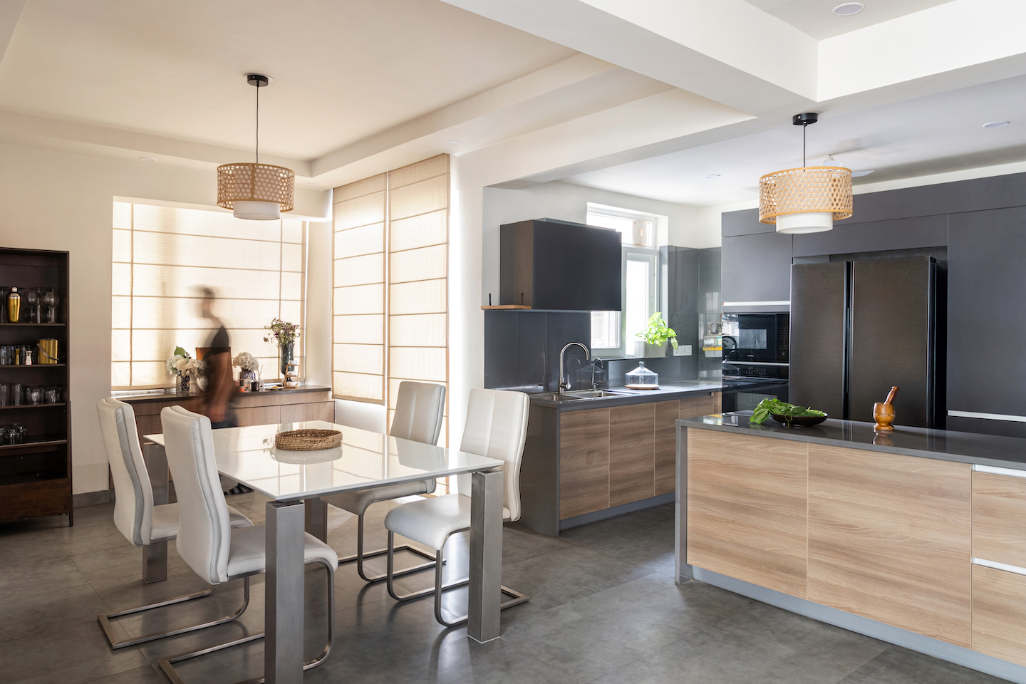 The flat was on the fifth level of a large, cramped residential complex with many buildings pressed close together. It was a 3BHK apartment which eventually was converted to a 2BHK apartment under the creative supervision of KOLAB and Studio Redefine.