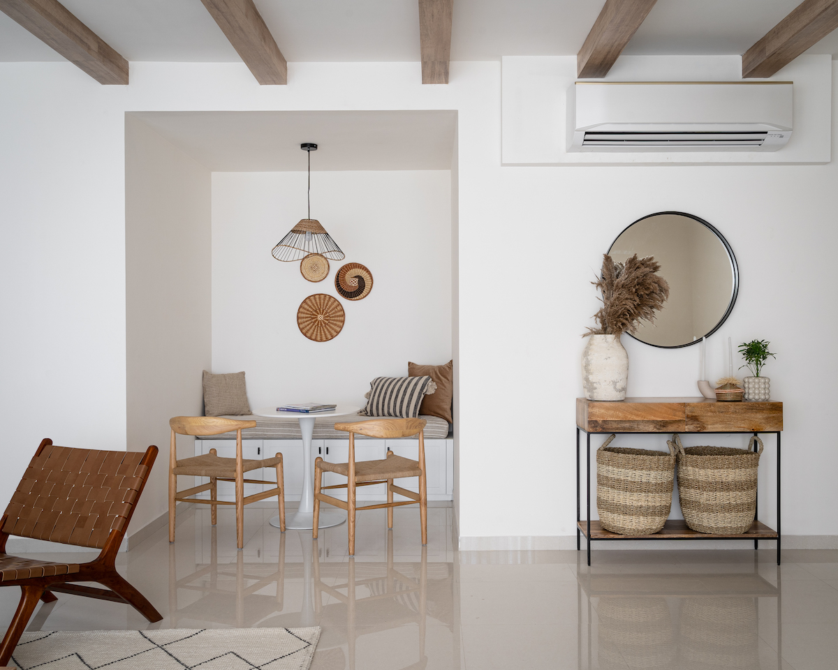 The compact foyer features wall-length cabinetry bathed in a warm grey hue, a built-in bench and open shelving systems to house miscellany. Woven rattan baskets, a leather-framed mirror, and indoor greens speak of an eclectic style, filtered by a laid-back aesthetic. The erstwhile prayer room, now transformed into a coffee nook, presents a cosy picture with its built-in bench, a white tulip-style table, and a pair of Wegner replica chairs surrounded by artisanal cane wall embellishments and a pendant light.