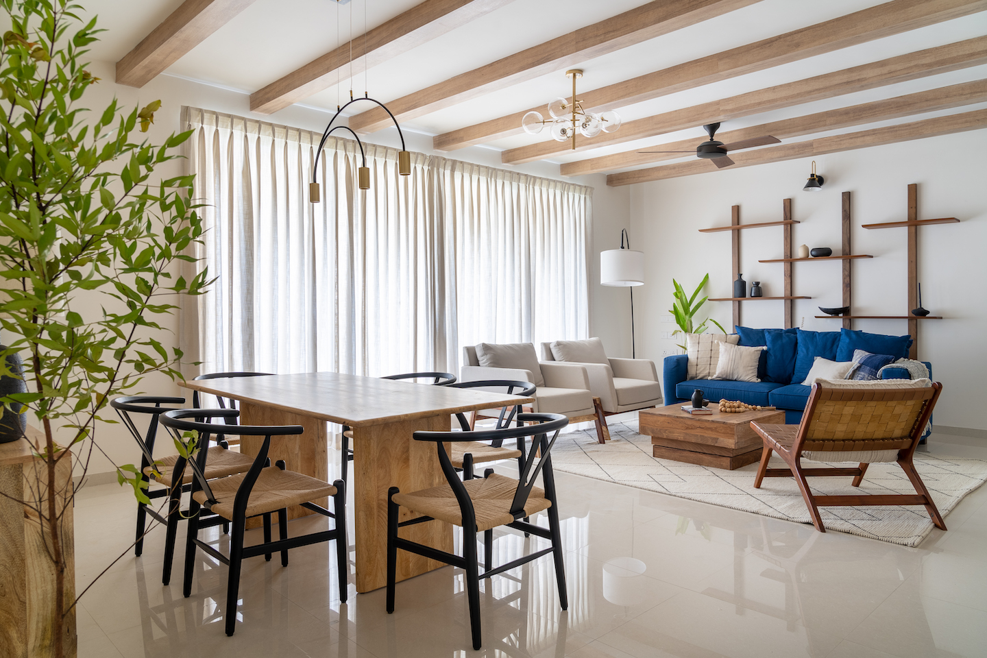 The spatial articulation was directed to reflect an ethos which would “view the coastal-chic inspiration from a lens of minimalism,” says Swati Kulkarni, founder, Let’s Create by Swati, which was tasked with embodying the vision of the home-owners. Reminiscent of beach houses along the coasts of Amalfi or Mallorca, the residence’s design intent was distilled to be bright, airy, earthy, and dotted generously with blue to echo vignettes of its context.