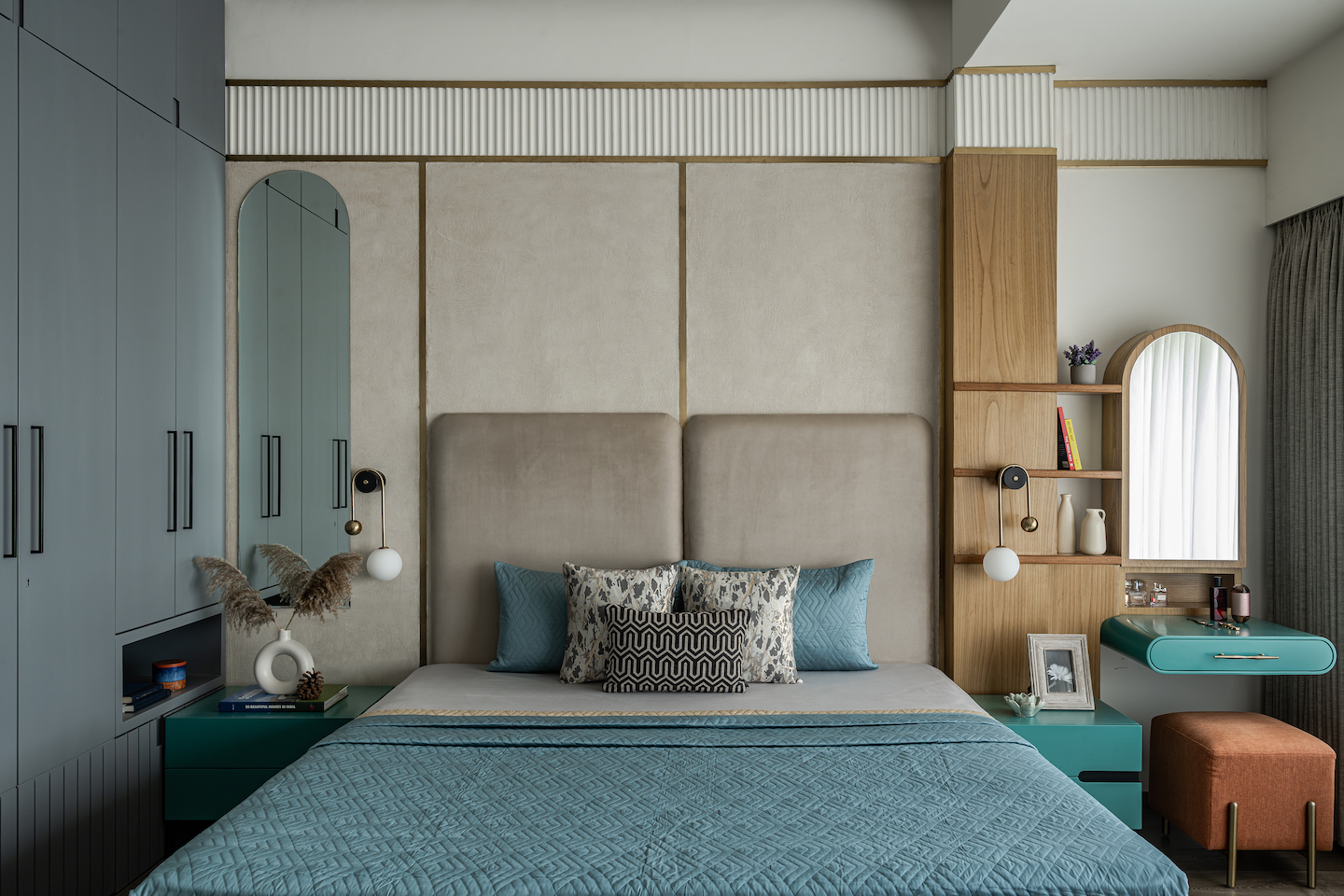 The son’s room is located near the above-mentioned crockery unit, and is highly bespoke in nature. Featuring a white, grey and green colour scheme, it has a wall texture with a PVD-coated golden strip to add a highlighting factor. Wooden fluted wall panels add depth and break the whiteness of the entire room.