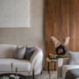 The living room gets a bit of privacy thanks to a glass partition, which can be opened to create a larger living space. This room features a sofa with two lounge chairs and a bench. “A cabinet in the corner functions as a multi-purpose storage and can be converted into a bar,” reveals Megha.