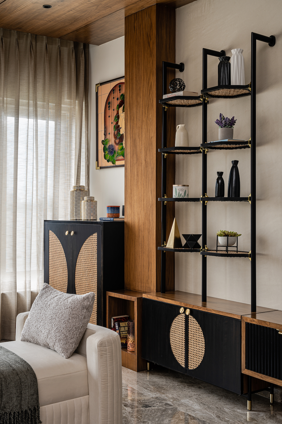 Given the objective of creating a contemporary home geared for modern living, the living room was converted into a bedroom, while a bedroom was made into a living room. A long wall at the entrance was taken down, and a single-entry kitchen made space for a mandir. By reclaiming dead areas such as shafts helped Megha stitch together a more expansive feel.