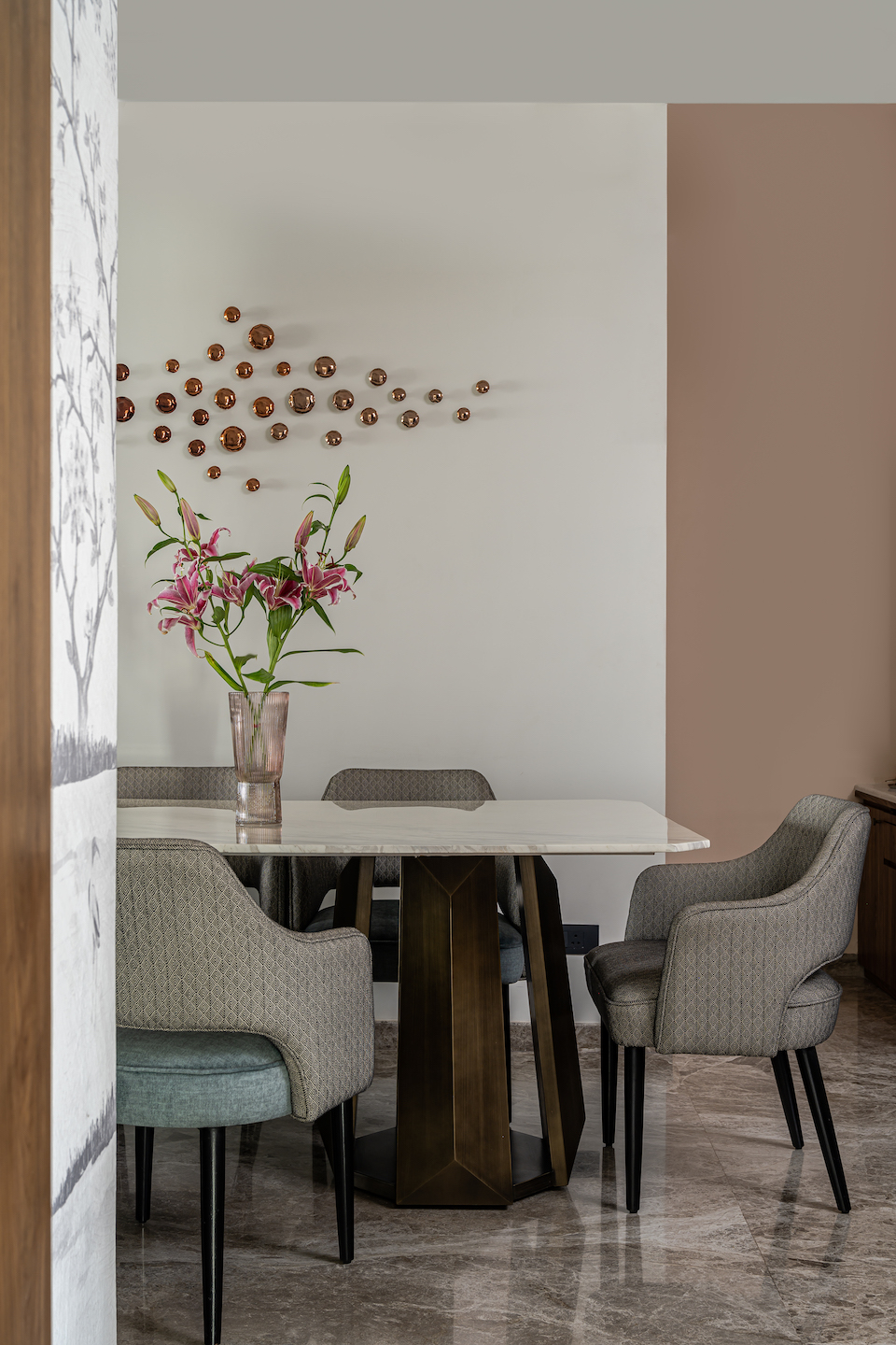 The entrance is defined by an elegant console, graphic artwork, a planter, and a few accessories. “We maximised the limited space against this muted concrete textured wall from Limocoat, and added a touch of antique brass and fluted glass. The kitchen lies on the right. And features quartz counters and backsplash. Opposite the kitchen is a large crockery unit, rendered from American Walnut veneer and fluted glass. The dining ensemble is bespoke: dual-toned chairs are paired with a statuario-topped table. Wallpaper from Kalakaari Haath adds an evocative touch. This space also includes a customised bench along the wall that functions as additional seating.