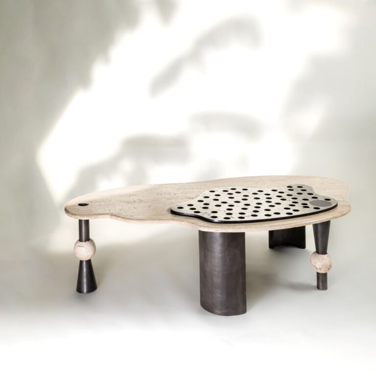 Sauve artistic aesthetics define The Otsu sideboard that demands attention, as do its unique solid granite rounded cone legs. The unorthodox organic perimeter of The Yoruba Coffee table, where perforated pyrite saddles an intriguing travertine top, is a celebration of imperfections. The fluid and asymmetry in this edit recall the one-stroke sketch and the Enso sense of meditative awareness.