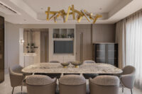 The home boasts four bedrooms, each having an individualistic styling. The master bedroom uses warm colours to amplify the texture of the Michel Angelo marble used on the headboard wall, while the son’s bedroom uses a cool scheme, carefully balanced with black and gold. The headboard wall is accentuated using smoky-effect textures, as a reflection of sea waves. The guest bedroom uses hues of beige and brown, against a tropical-style wallpaper on the headboard wall.