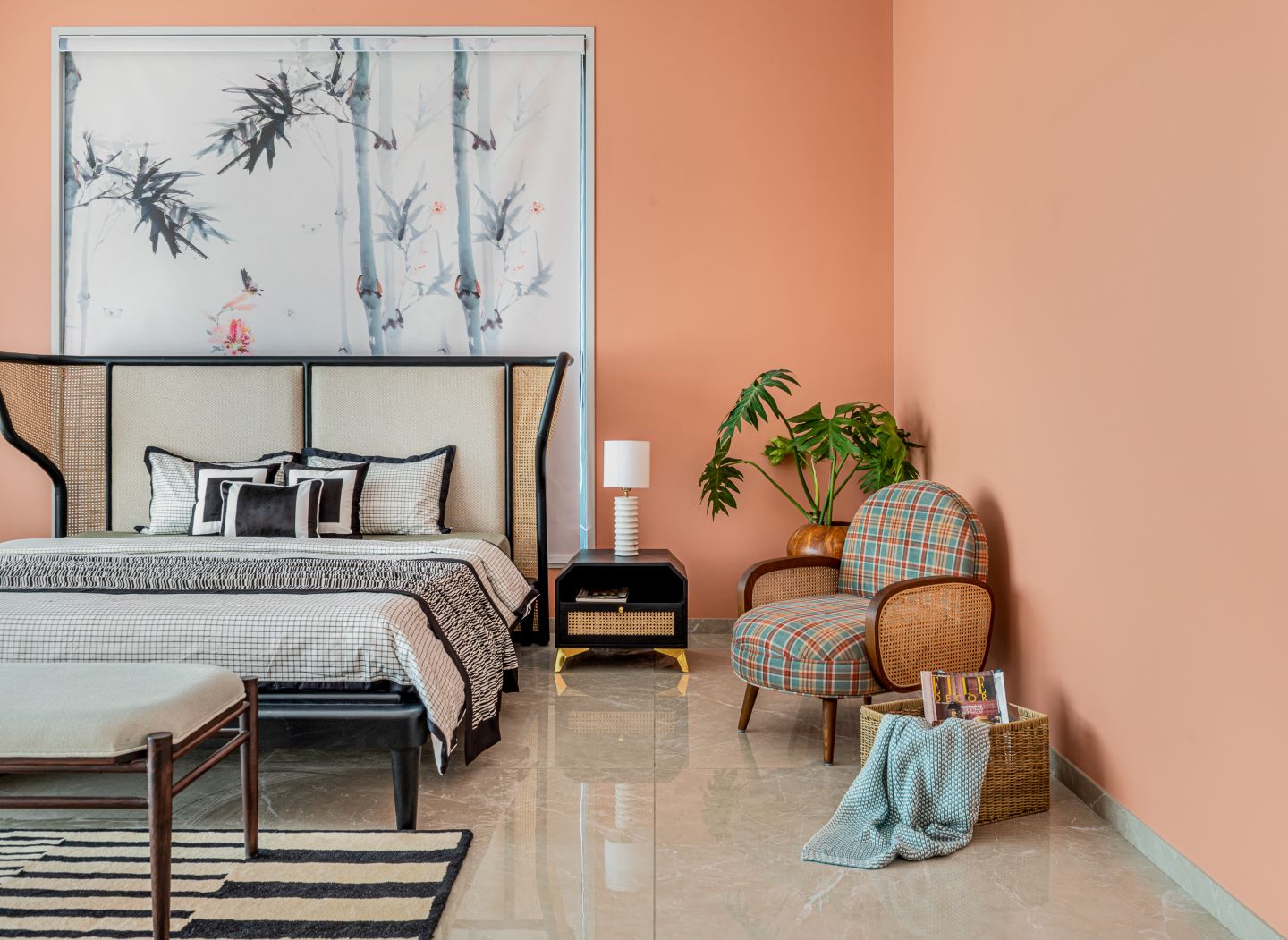 The master bedroom radiates a young energy with its peach colour story and selection of furnishings. The customised curtain made to look like a mural wall adds a personalised touch to the space. The details of cane and black polish in the furniture complement the peach coloured wall, creating a cohesive and stylish design. Overall, the design is well thought out and balanced, with attention paid to both aesthetics and functionality.