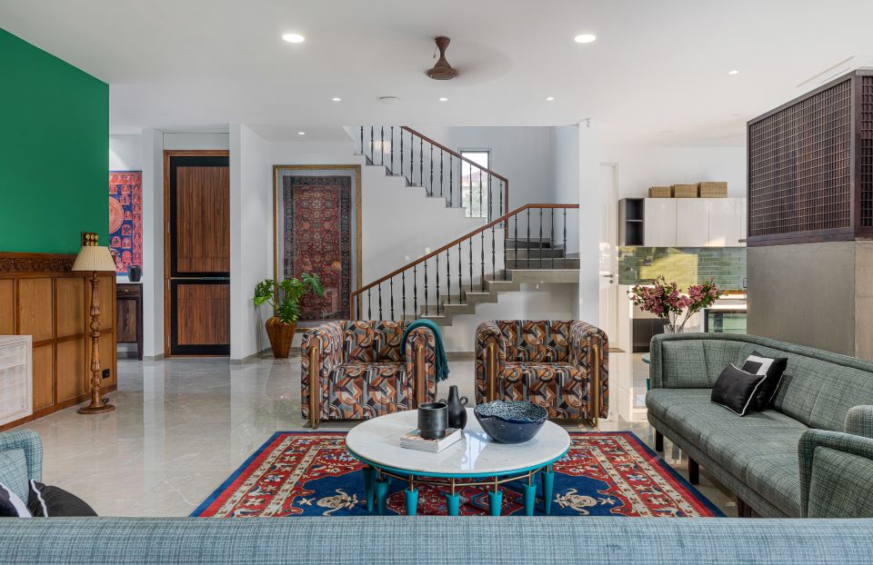 Located in an upmarket locality at Ankhleshwar, The Floating House designed by P&D Associates has an exterior which draws inspiration from mid-century architecture. While the exteriors witness clean lines, shades of black and grey and the use of MS C-section framing; the interiors have an open layout which encourages communication and bonding between the users. The vibrant ornamental wallpapers paired with vintage lamps and light shades of veneer create spaces with a modern outlook on vintage styles.