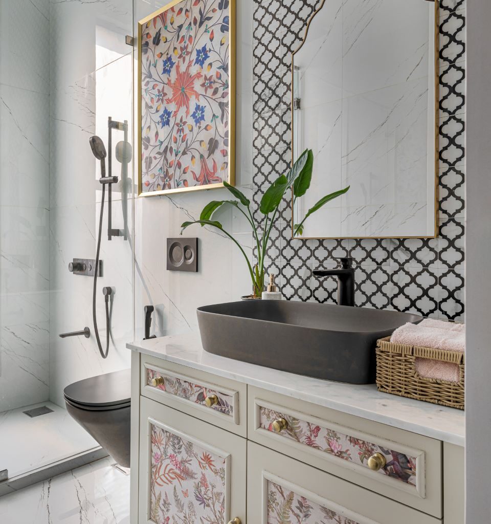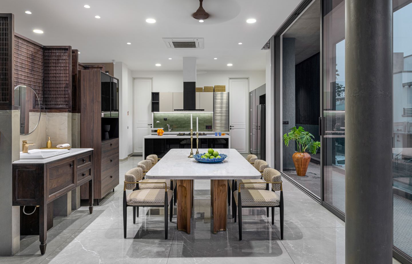 The designers decided to welcome everyone into the house by placing a vibrant 3′ x 4′ pichwai painting from a local artist in Nathdwara at the foyer. The living space had the choicest of furniture pieces and handpicked accessories and furnishings… reflecting a modern and sleek design. The kitchen space is kept chic and airy, opening up to the huge dining space, making it a great place for gatherings and socialising. The dining table is placed close to the kitchen and flaunts skinny wooden legs and brass details. The simple white Italian marble top of the table creates a stunningly beautiful contrast with the warm and rich wooden legs and brass details. The pairing of the Indian print fabric chairs add a touch of cultural and aesthetic appeal to the design.