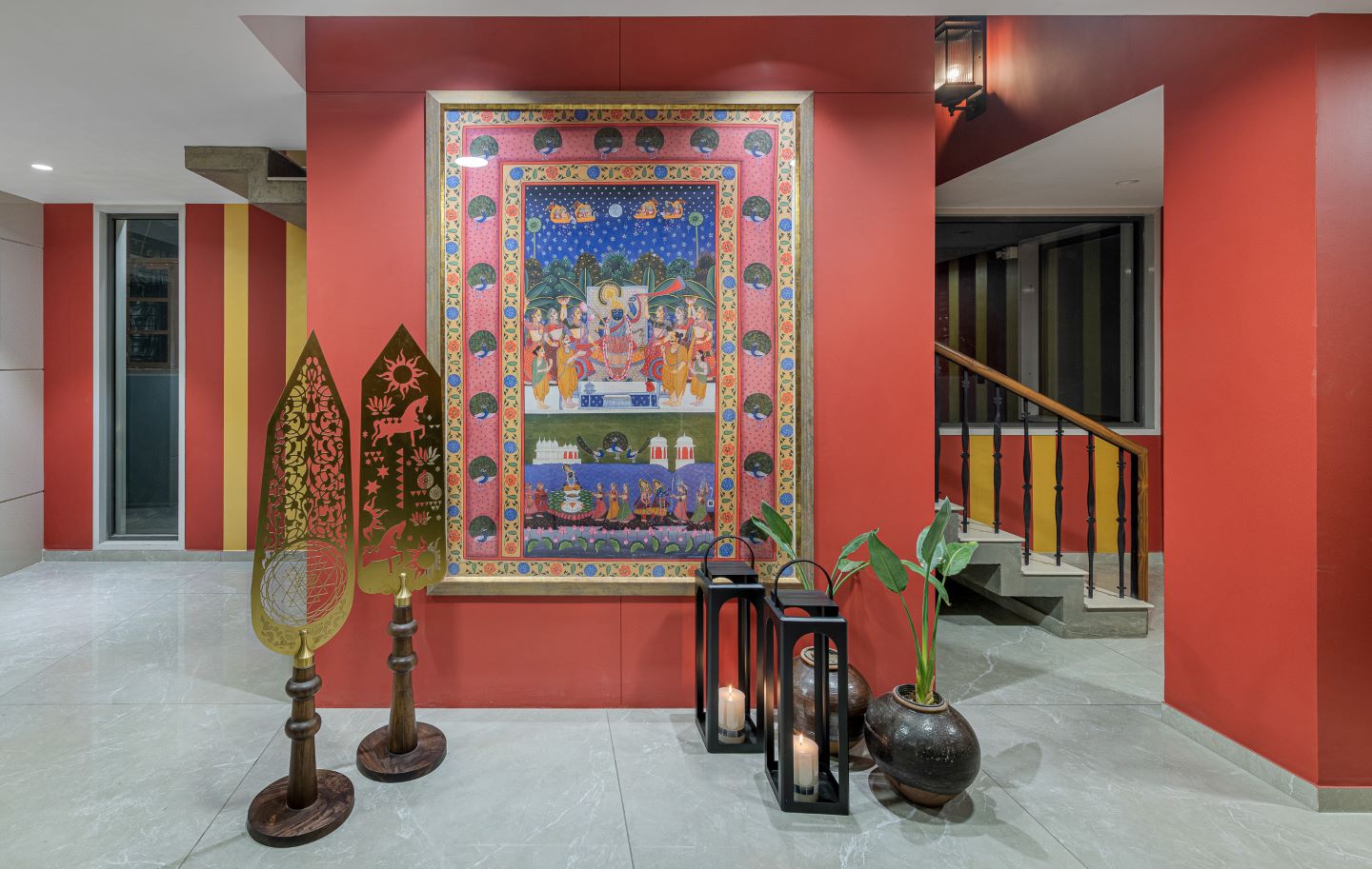 The interior was heavily influenced by modern art deco principles, with luxurious materials such as exotic woods, marble, and metals being used on surfaces and in the making of some bespoke furniture and furnishings. Additionally, prominent furniture pieces were sourced from Italy to add luxury and sophistication to the design. The use of the traditional pichwai art form throughout the house adds a sense of awe and grandeur to the space. “Pichwai is known for its intricate and detailed designs. We incorporated this art form into the interior design to add a sense of cultural and historical significance to the space. This makes the project more than just a stylish and luxurious one, but a space with cultural and artistic depth,” explains Devang Devang Patel and Pratik Siddhpura; principal designers, P&D Associates.