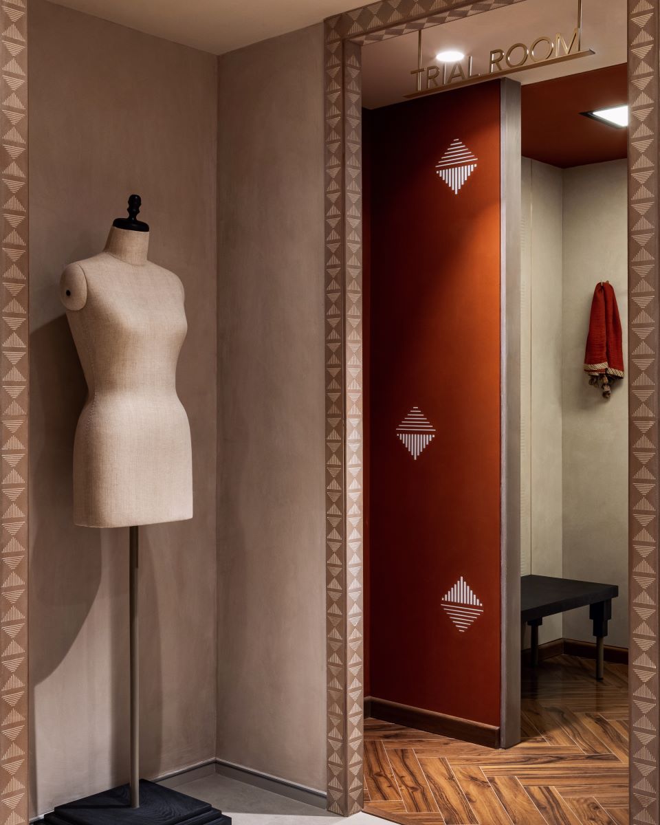 The interiors feature an earthy material palette, providing a pared-down backdrop for the merchandise. Lightly textured Shera board walls imbue the spaces with a tactile quality. A distinctive triangular pattern that draws from a variety of textile traditions, including phulkari, shibori, ikat and kanjeevaram; runs as a common thread through the store, finding expression in the grey tiled flooring, the fabric sandwiched glass partitions and the timber display units. It is also stencilled and printed on the walls of the trial rooms and the staircase.
