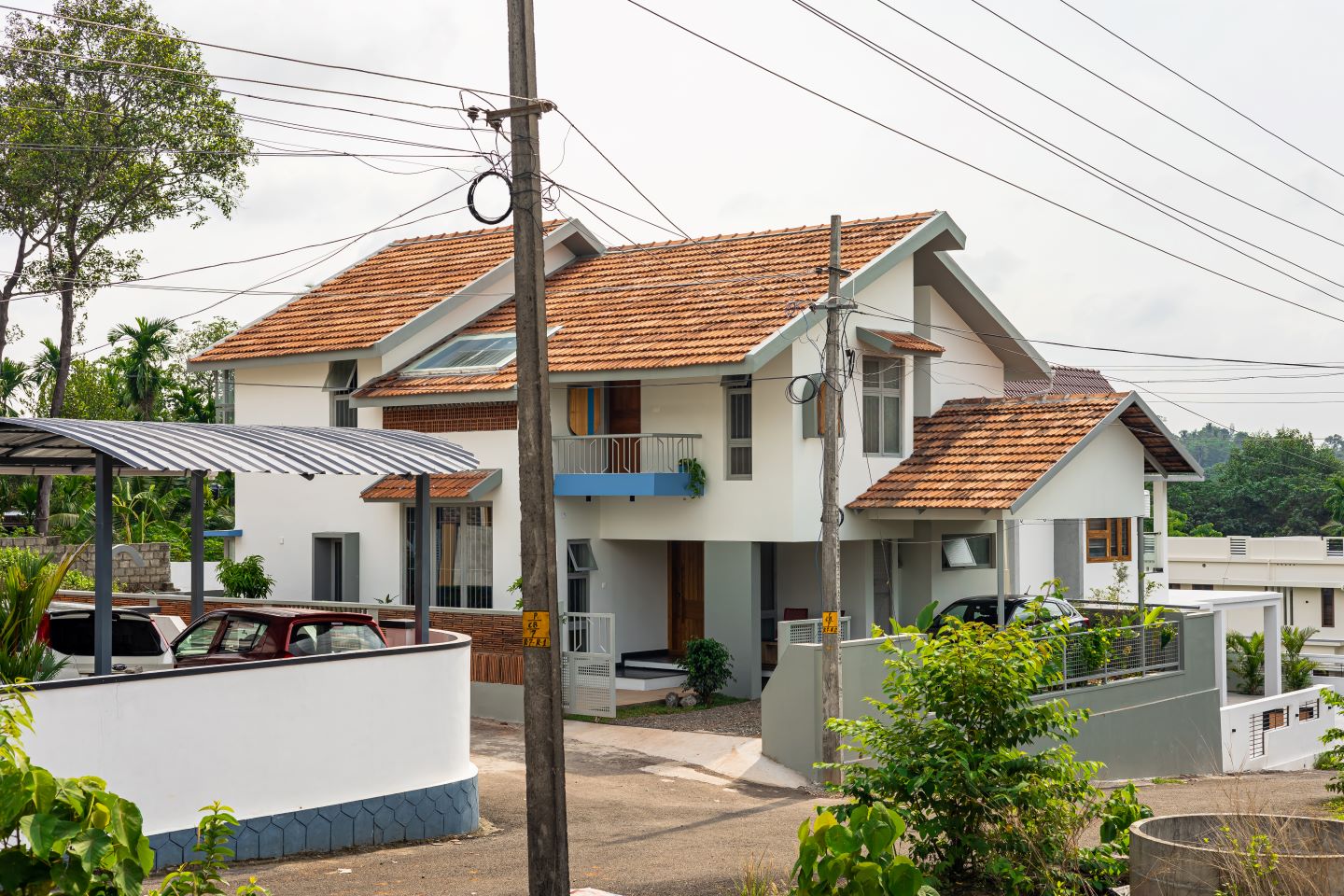 Roshan Villa, designed by Tales of Design Studio, is located in the growing suburban residential community of Puthencruz, Kochi. The villa sits on a 2,250 square foot rectangular corner plot, with south and west facing roads creating two frontages; and residential buildings on the other two sides. Considering the sloping profile of the southern plot boundary, and to enable back to back parking, the entrance to the site is kept from the western end.