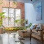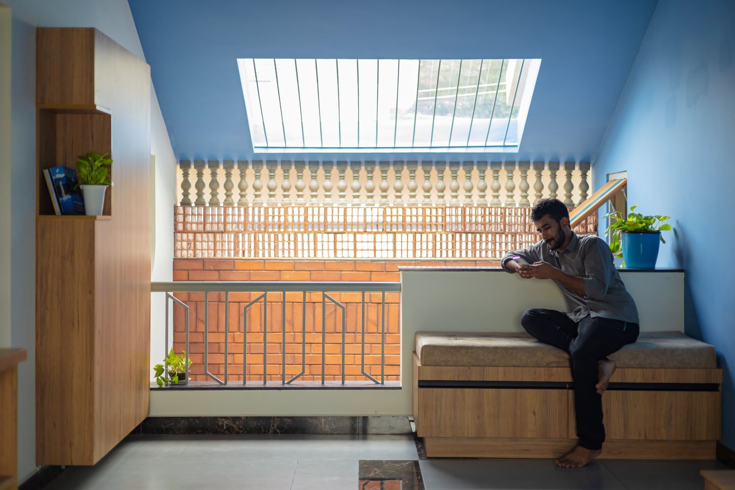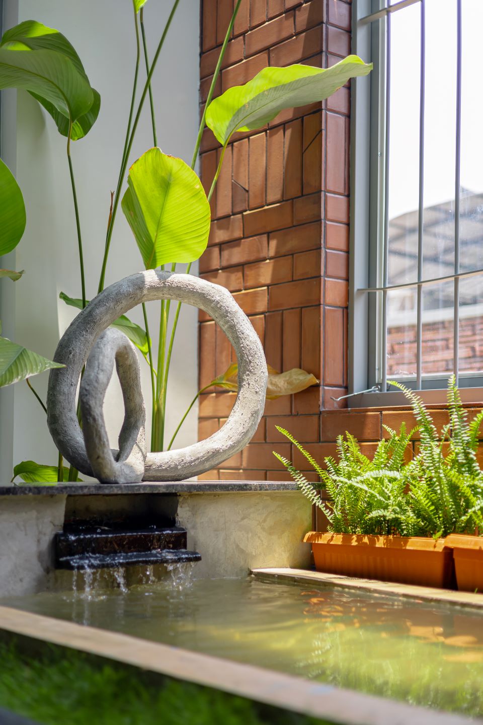 Roshan Villa has an L-shaped floating verandah that leads to the entrance foyer. The common areas of the villa — a formal living room with an attached indoor courtyard, a dining and kitchen — have an open plan. The courtyard is a sun-kissed space which feature bricks, water and lush greenery. The inspiration for the inner courtyard wall and west side compound wall came from ‘Kasavu’ (the zari detailing seen in Kerala sarees). A sequence of concrete balusters and Porotherm jaalis on the courtyard wall enable air passage due to the stack effect, thus regulating indoor temperature. The private spaces are arranged in a grid, around these common areas, to reduce circulation area and to keep a compact home.