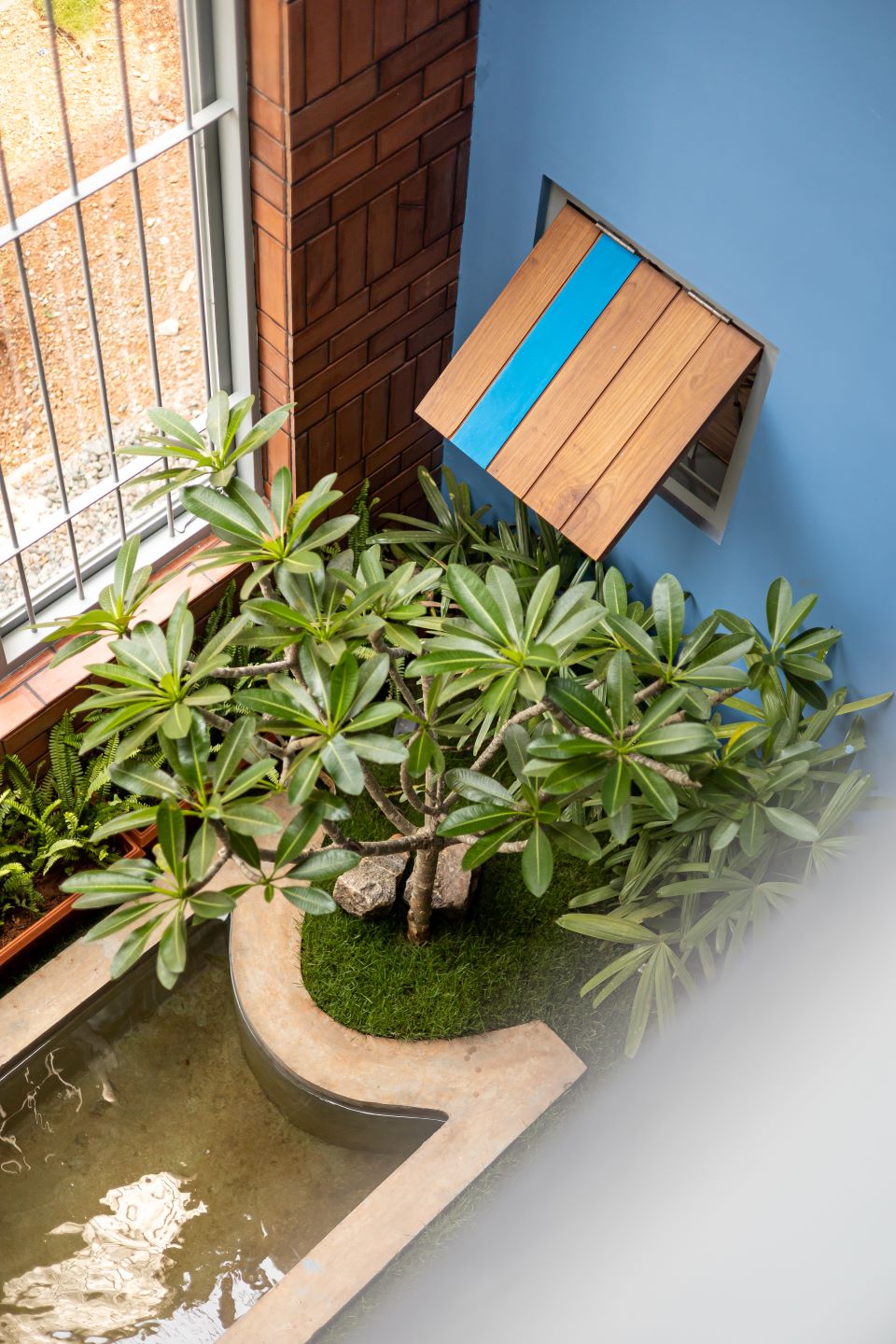 The major materials of construction were rubble, solid cement blocks and concrete; while discarded Mangalore roofing tiles were utilised for topping slopped roofs, and in the construction of the west side compound wall. The doors and windows are a mix of polished wood and powder coated GI frames. Flooring patterns are created using granite, and matte and glossy vitrified tiles. The off-white colour which dominates the villa is offset by splashes of grey and highlights of blue. The bedrooms don pastel hues.