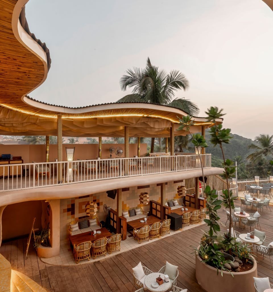 Located at the scenic Ozran Beach in Goa, on a cliff overlooking the sea is Dubki (Dawn and Dusk Bar) — Maze Concept Design LLP’s newest creation. Set in a lane well known for a few F&B brands, the entry to site was quite narrow but it enjoyed a wide view of the sunset. There was an already existing dilapidated deck supported by MS structures which was used for parties during the peak season in Goa.