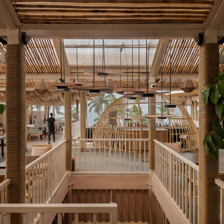 The main highlight is the layered roof which represents a wave in the sea with the horizon as a foreground. This roof was layered with heat-absorbing onduline sheets at the top, while a structure was a thin fabric was freely suspended at the bottom to cover the metal. These fabrics were again cut organically to represent waves and were positioned in the direction of the sea breeze to mimic waves. Straightened bamboo underside cladding was used towards the periphery of the roof and a RGB profile light was hidden to highlight the bamboo during late evenings till dawn.