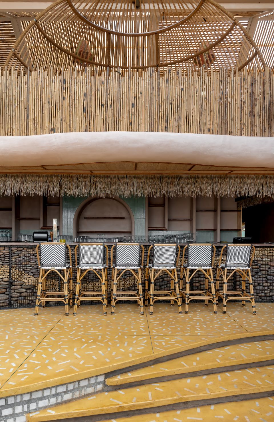 The material palette was carefully chosen to withstand the high salt content and humidity present in the air, and the harsh climatic conditions of the region all year round. Therefore, natural materials like bamboo, cane, pigmented concrete and natural stones feature prominently in Dubki. The colour palette has a very warm tone with subtle highlights (to impart a smart casual vibe) brought in through pastels, earthy colours and textures.