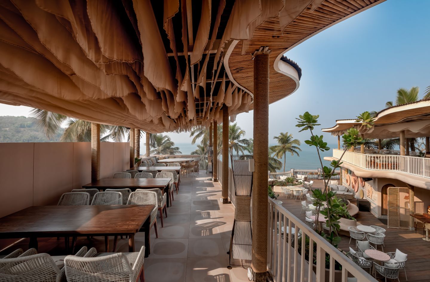 The experience starts off with a long walk which transitions into different spaces with lowered volumes and opens into a deck with a large vista and infinite volume. The kitchen is located at the first floor and is an extension of the deck towards the entry pathway. The bar is located right after you enter the deck and is facing the sea. On either sides of the central deck there are two wings which extend towards the ocean. These wings act as a covered seating area, they have booth seating and different furniture arrangements to accommodate both small and large groups.