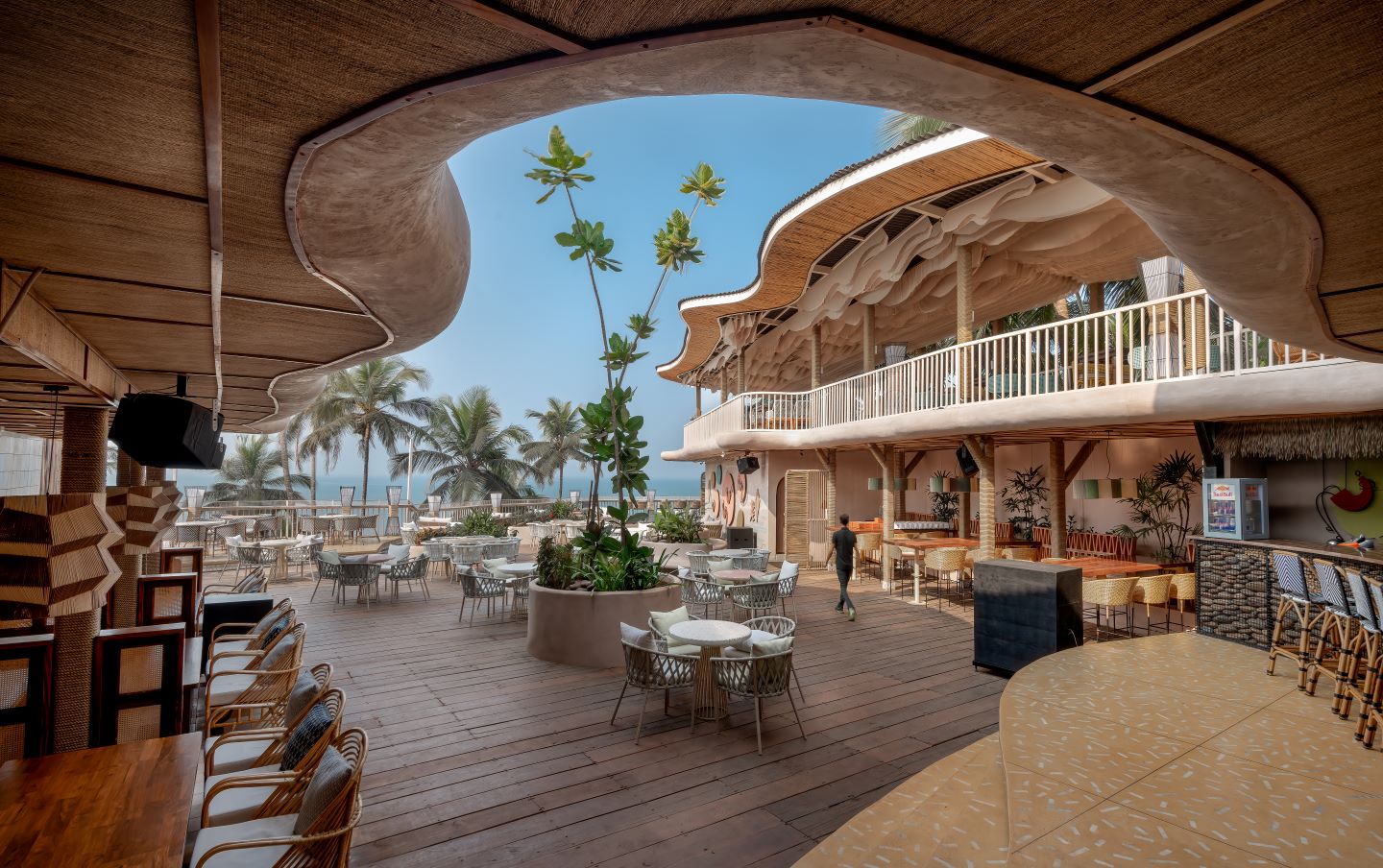 At the periphery of the deck, there is an elevated area which has movable seating, this can also be converted into a stage for the DJ, or a live band to perform. On the first level, a dedicated DJ pod is located right at the central axis of the bar and the open deck. And towards the sides are the wings which project towards the ocean. At the rear side of the DJ pod is the kitchen and other services.