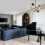 The living room exudes a sense of refined charm, enhanced by its tasteful arrangement of furniture and captivating details — such as the elegant piano gracefully positioned on the right side of the entrance. A comfortable blue sofa and a statement armchair invite you to relax and unwind in style. Nestled nearby, a magnificent marble fireplace emanates warmth and sophistication. Above, an arch with a sturdy metal structure and beautiful veneer stands as a striking architectural feature, adding a touch of contemporary elegance.