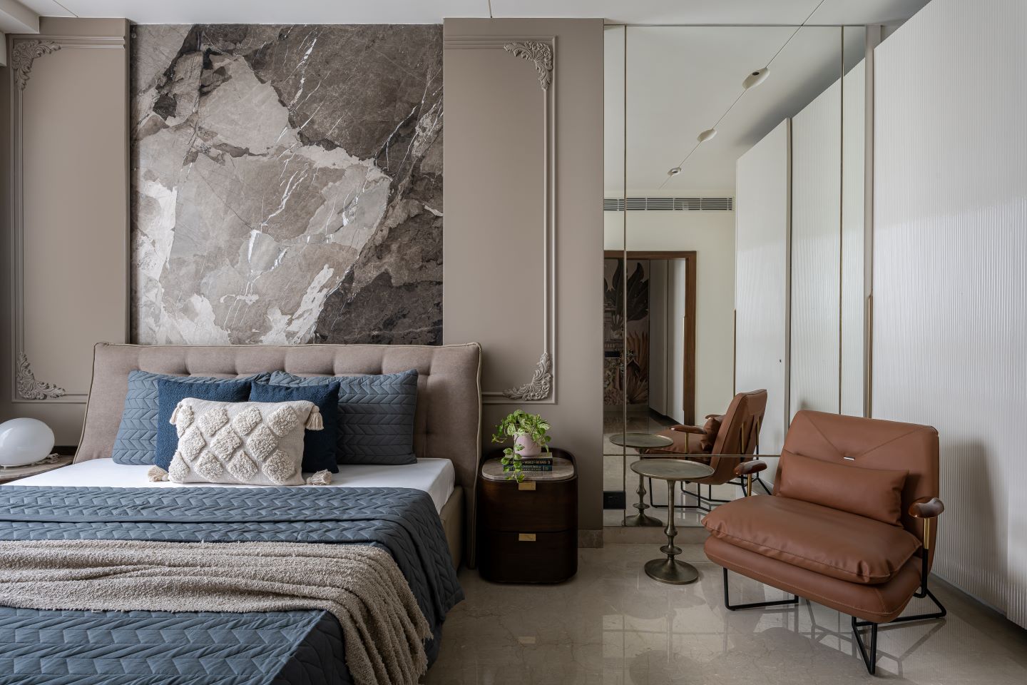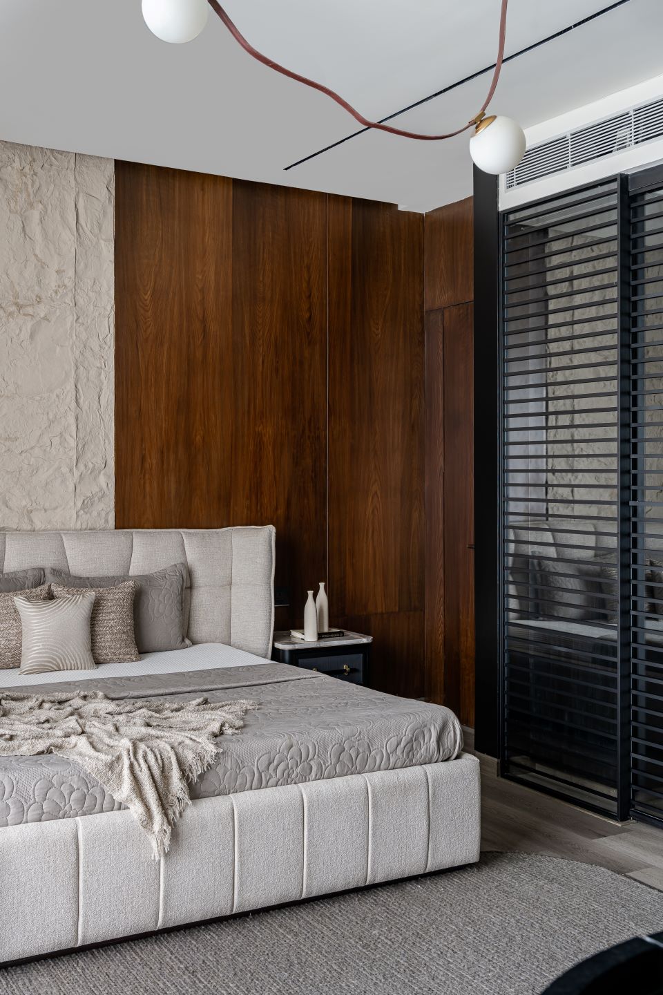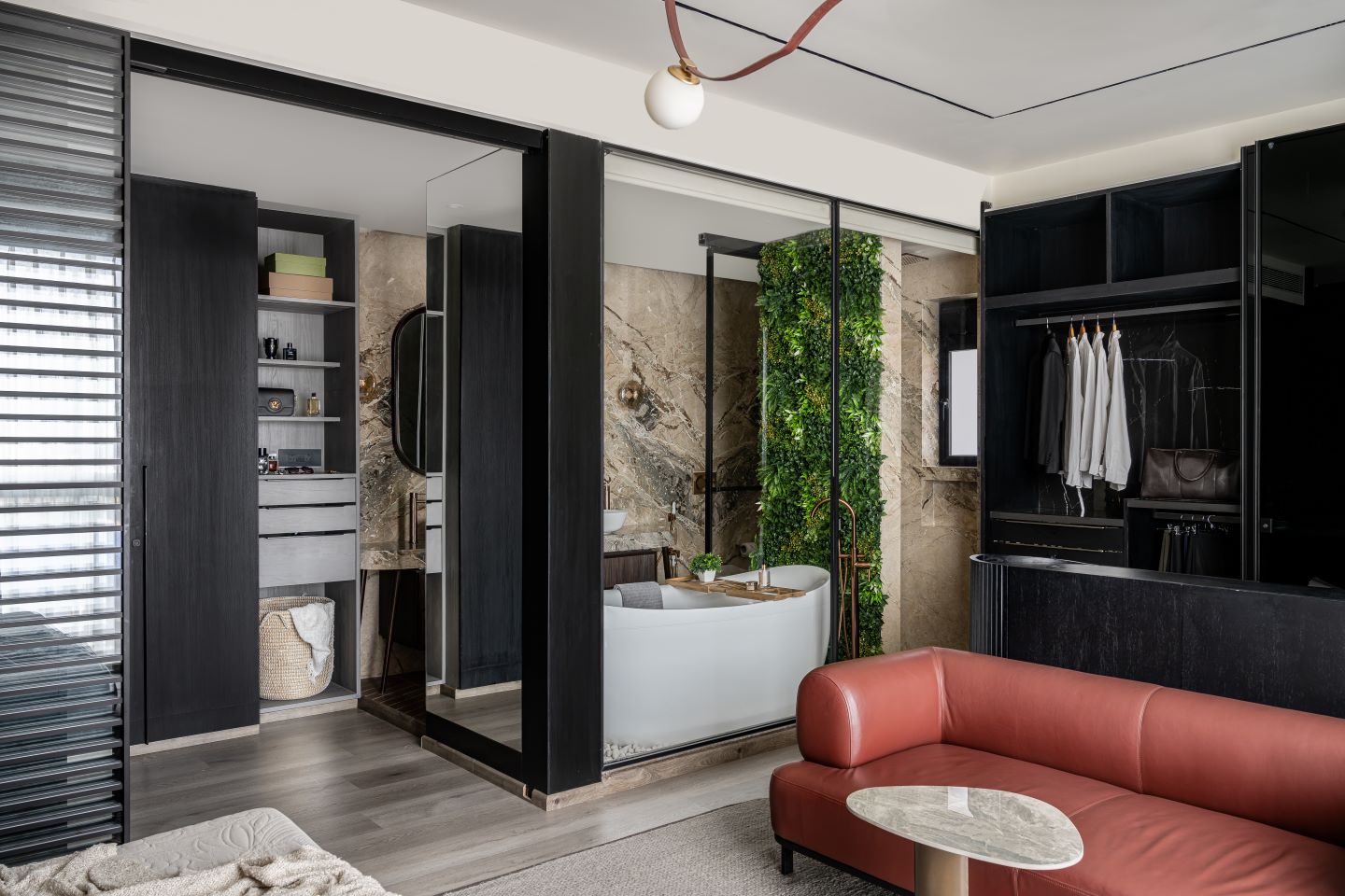 The master bedroom is a luxurious and well-designed space. The stone panel and veneer wall add a touch of natural beauty and texture to the room, creating a warm and inviting atmosphere. The presence of a burgundy leather sofa enhances the richness of the decor, providing a comfortable spot for relaxation. Underneath the sofa, the custom-made pleated rug adds a layer of elegance and visual interest to the flooring. The floor-to-ceiling windows in the master bedroom allow plenty of natural light to enter the room, creating a bright and cheerful ambiance during the day. Offering flexibility, a sliding partition opens up the area and connects it to the airy and refreshing bathroom.