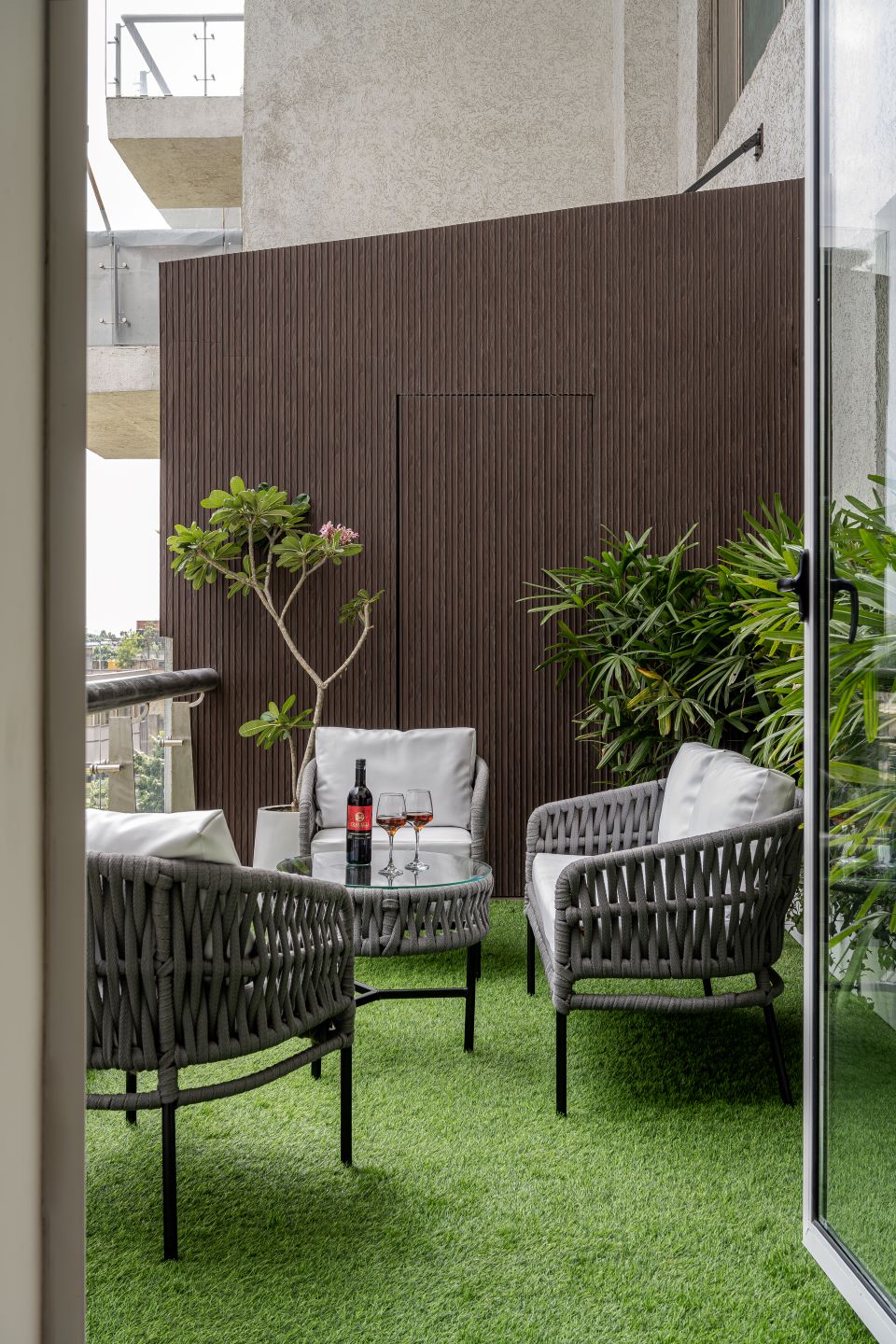 The balcony acts like a wonderful and inviting oasis in the midst of the city. The plants placed strategically behind the sofa not only add privacy but also bring life and greenery to the space. The turf floor adds a unique touch, giving a sense of being grounded and connected to nature, despite being above ground level. The triple-height ceiling enhances the feeling of openness, providing clear views of the skies and creating a terrace-like experience.