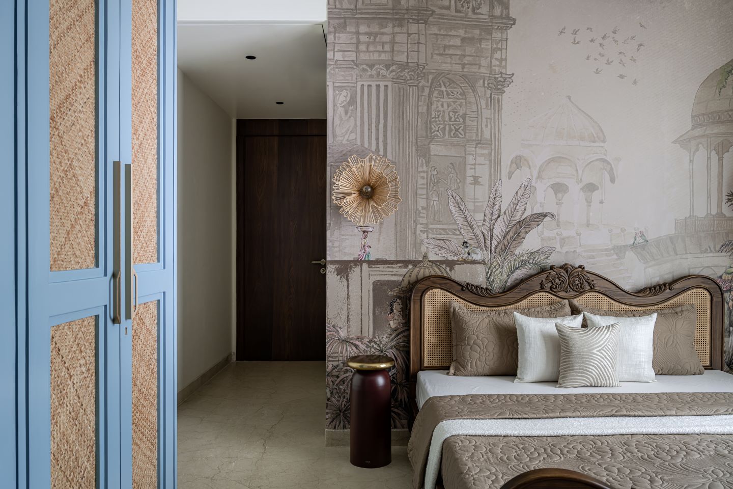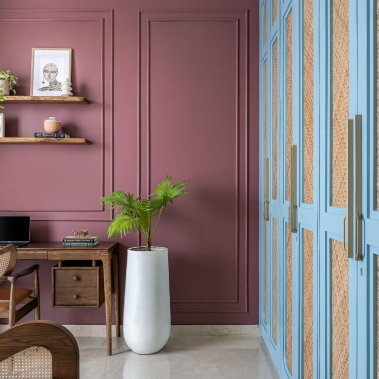 The guest room blends modern elements with an earthy and inviting feel. The bed with its carvings and cane work exudes old-world charm, adding a touch of nostalgia and elegance. The striking blue wardrobes with cane work create a bold and unique focal point, adding a touch of creativity and craftsmanship to the room. The blue colour of the wardrobes complements the maroon colour of the study wall, creating a harmonious and visually appealing contrast. The study area is tastefully designed with teak wood shelves and a solid wood study table, giving a sense of warmth and sophistication. The addition of green plants brings a refreshing touch of nature indoors, adding life and vibrancy to the room.