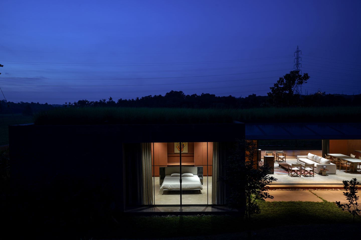 The special structural design resulted in a beamless ceiling. Lighting was concealed into the roof slab, to maintain a minimal architectural style. The roof is planted with vetiver grass (khus, miracle grass), for both its properties and its aesthetics to mimic the field. The principles of permaculture are brought into the landscape. “Sustainable landscapes are not only about what they look like but what they do,” explains Zarine.